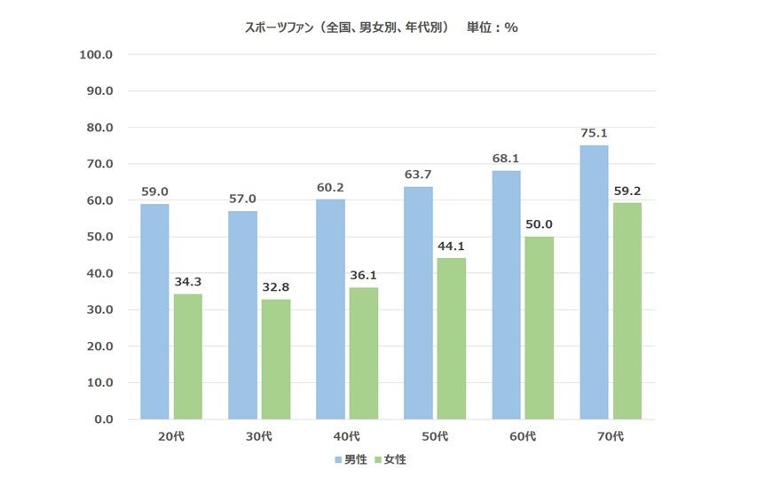 スポーツファン層は、男女ともに70代が最も高い