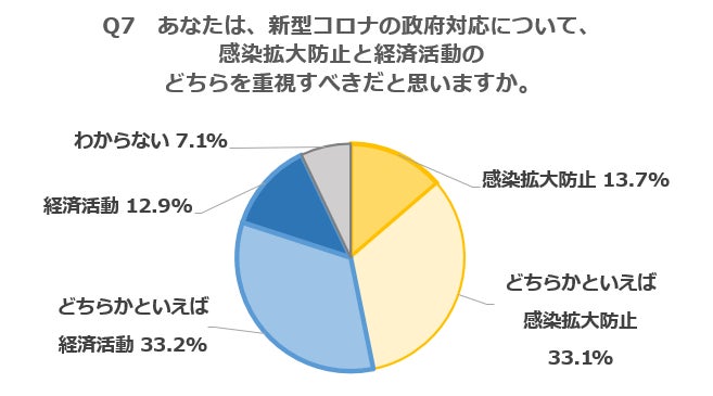 - 政府の新型コロナ対応で重視すべきは、それぞれ「どちらかといえば」を含め「感染拡大防止」46.8%、「経済活動」46.1%で拮抗した。(Q7)