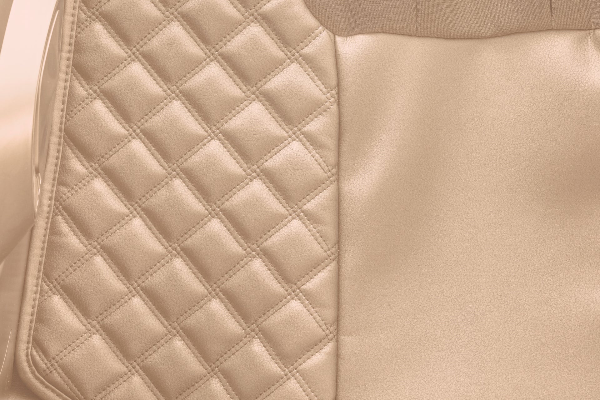 背面のシート部分は滑らかな触り心地のソフトレザーでキルティング加工を施し、エレガントな印象に仕上げています。背もたれの上部の淵には柔らかな青い光を放つ「アンビエントLEDライト」を搭載し、点灯させることで心が落ち着くようなリラックス空間を演出できます。