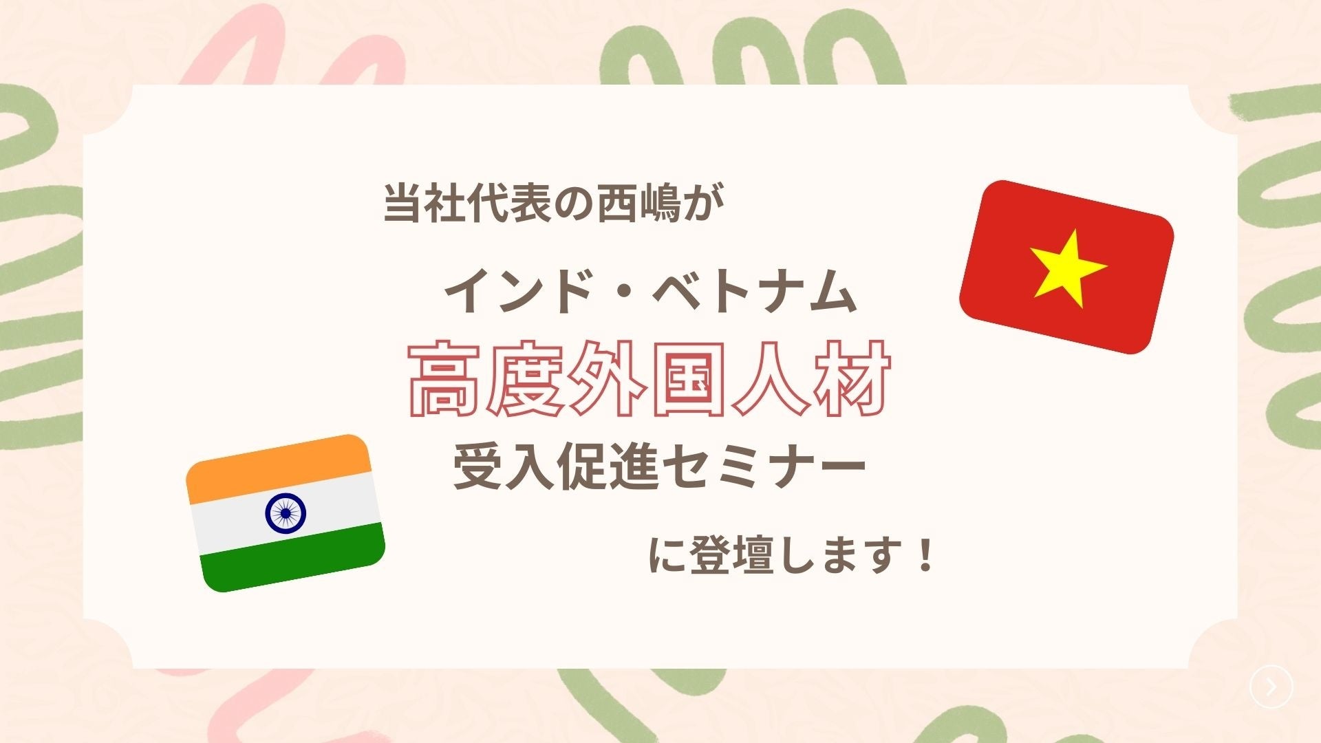 当社代表の西嶋が「インド・ベトナム高度外国人材受入促進セミナー」に登壇します!