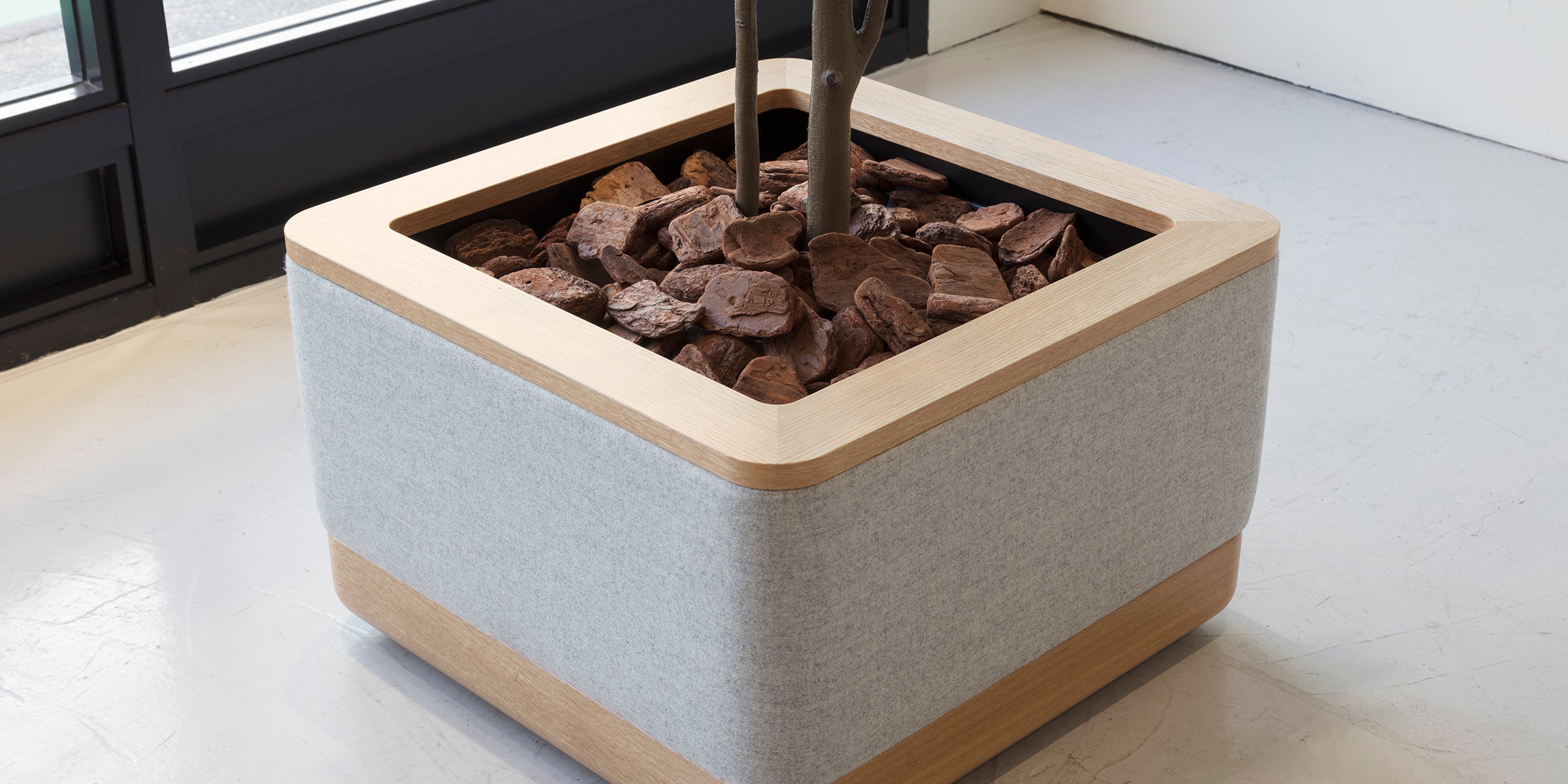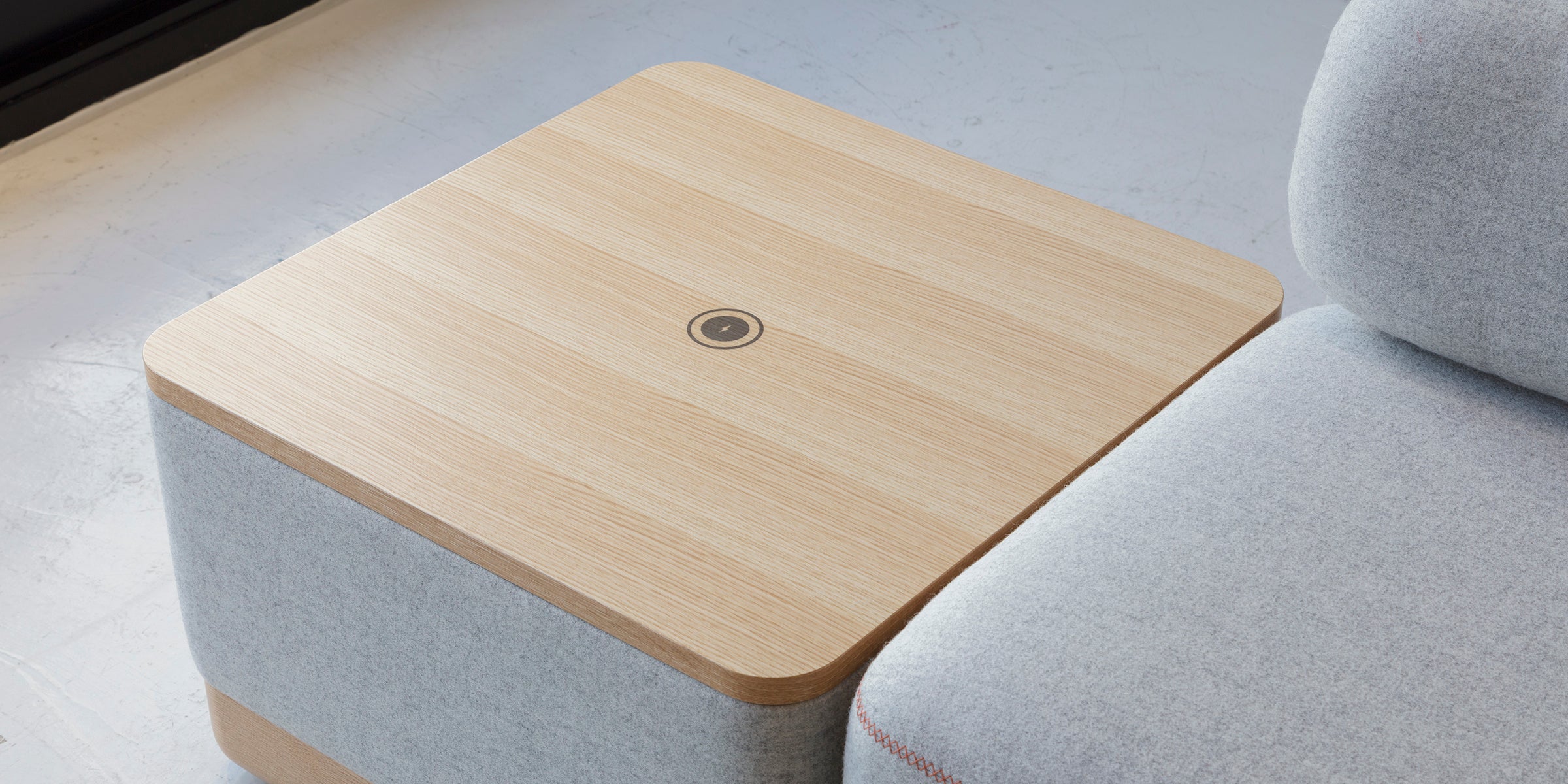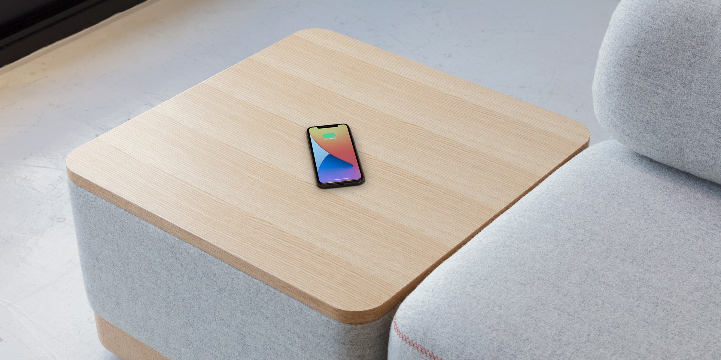 そのほかにも、良質なオーク材を使ったアームチェアやバースツール、包み込まれるようなデザインのラウンジチェア、キュートな形状のミーティングチェア、そして、世界的なデザインスタジオSTONE DESIGNSにデザインを依頼し、今年の5月に発表後大きな反響を頂いている「TOFFEE」に新しい追加ユニット「トフィ― エクストラユニット」シリーズをリリース致します。ワイヤレス充電を搭載したプランターユニット、テーブルユニット(パーティションあり、なし)の全3モデルで、中央の充電マークの上に置くと自動的に充電が開始されます(iOS、Androidスマートフォンに対応)。