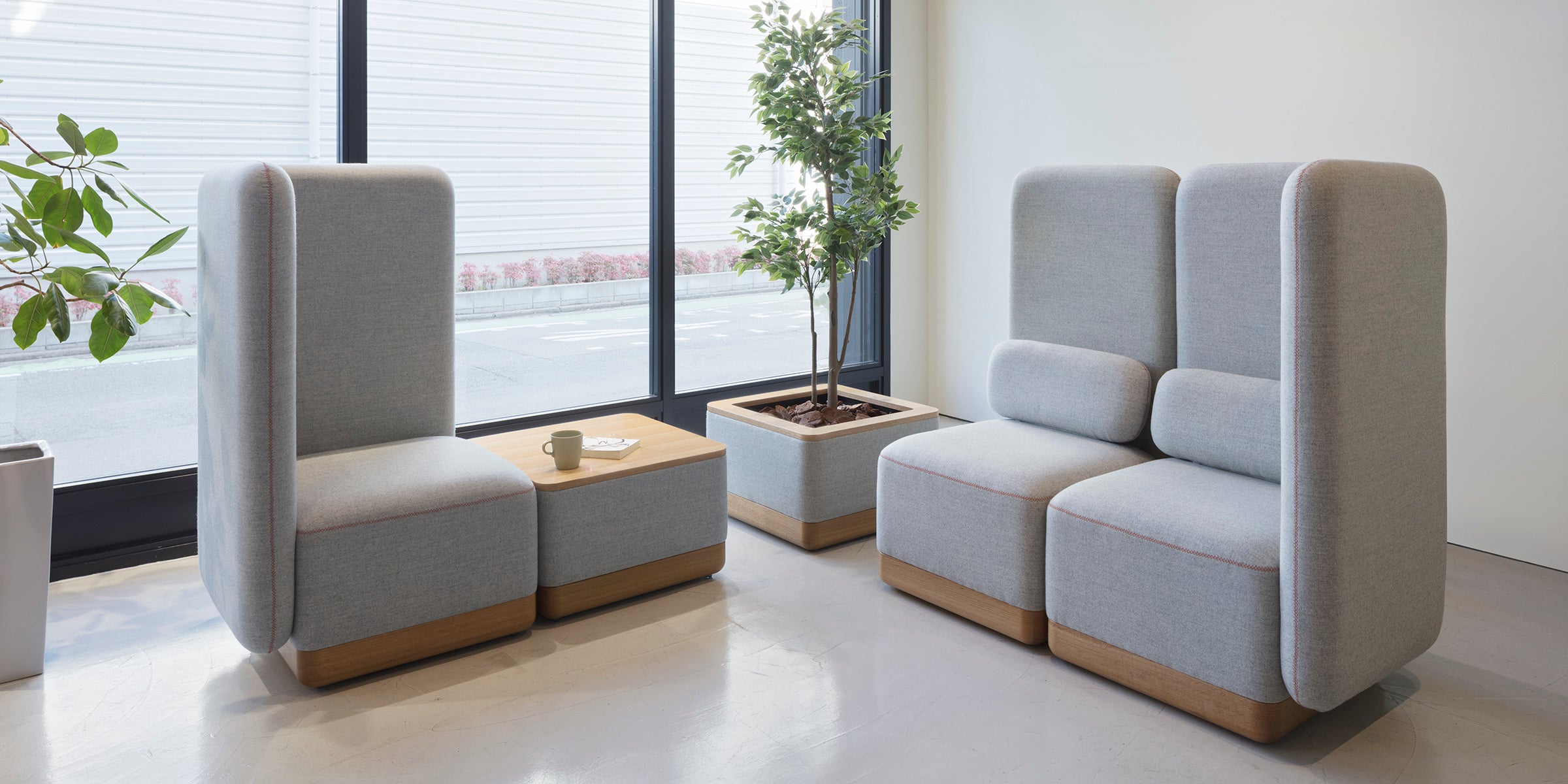 パーティションにはボタン締めをあしらい、視覚からもリラックスできるようなデザインに。空間を緩やかに仕切るパーティションはハイタイプとロータイプの2種類の展開です。