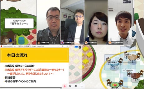 オープンスクールや留学セミナーでは、このバーチャルキャンパスにオンラインでご来校いただき、本当の授業さながらの学び体験を楽しんでいただけます。