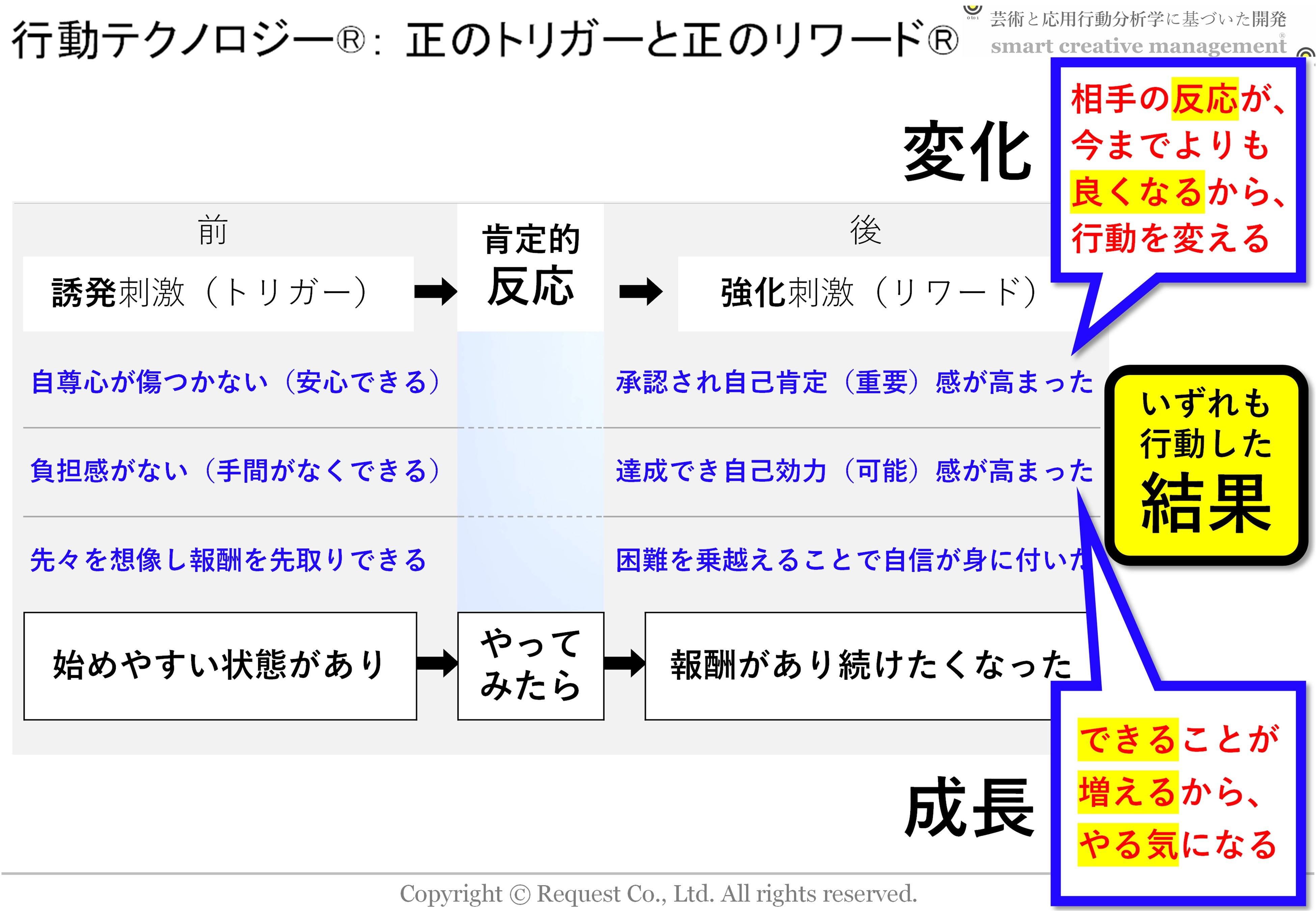 今、できている人は、「やる か やらないか」「やれば(試行錯誤を繰り返している内に)上手く行く」と言う。これはそのとおり。しかし、そう言われても「やれない」「できない」、傷つき、続かない。「今、できない」のは失敗では無く「できる」になるためのプロセス・過程。始めは誰もが「できていない」のだから。「失敗はできることを増やすための手段」ととらえられるようにしてくいくために、行動テクノロジーを使っていく。
