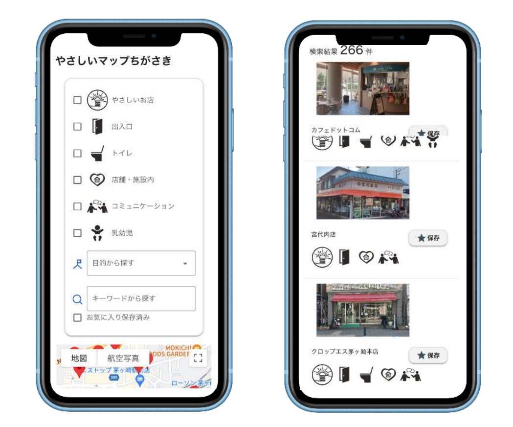 茅ヶ崎市では、障がいを理由とする差別を行わないことや合理的配慮に取り組む店舗等にステッカーを配布する「みんなにやさしいお店ちがさき事業」を推進しており、事業にご賛同いただき、茅ヶ崎市が定める項目に宣誓された店舗等の情報を「やさしいマップちがさき」に掲載しております。掲載店舗及び公共施設数は、機能リリース時点で250を超えており、今後も順次追加を予定しております。