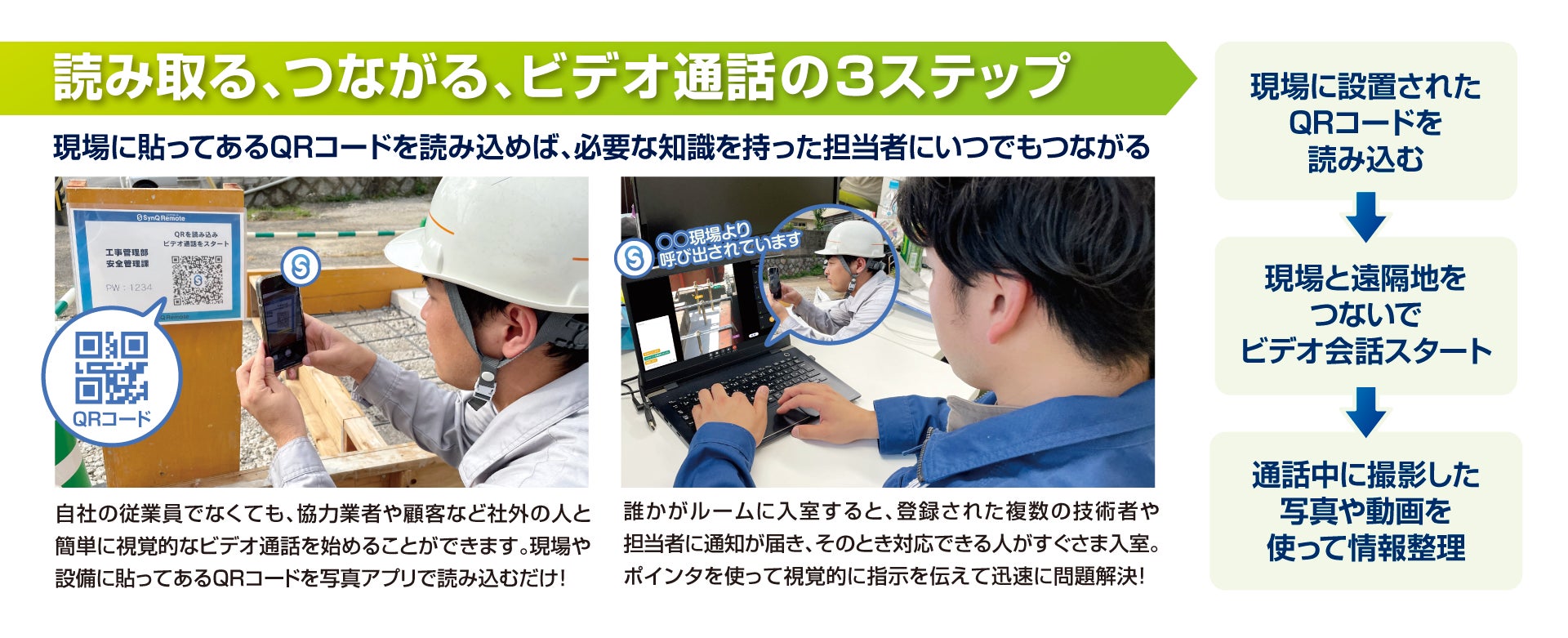 現場にいる担当者は、遠隔にいる管理者や技術者に確認したい問題が発生したとき、すぐに現場に貼ってあるQRコードを読み込みグループ通話に入室します。すると登録されている複数の技術者のスマホやPCに通知が届き、そのとき応答できる技術者が通話に入ります。リアルタイムの映像上にお互いのポインタを出し合いながら問題点を確認、テキストや描画での指示も書き込める写真や動画を証跡として残し、通話を終えることができます。