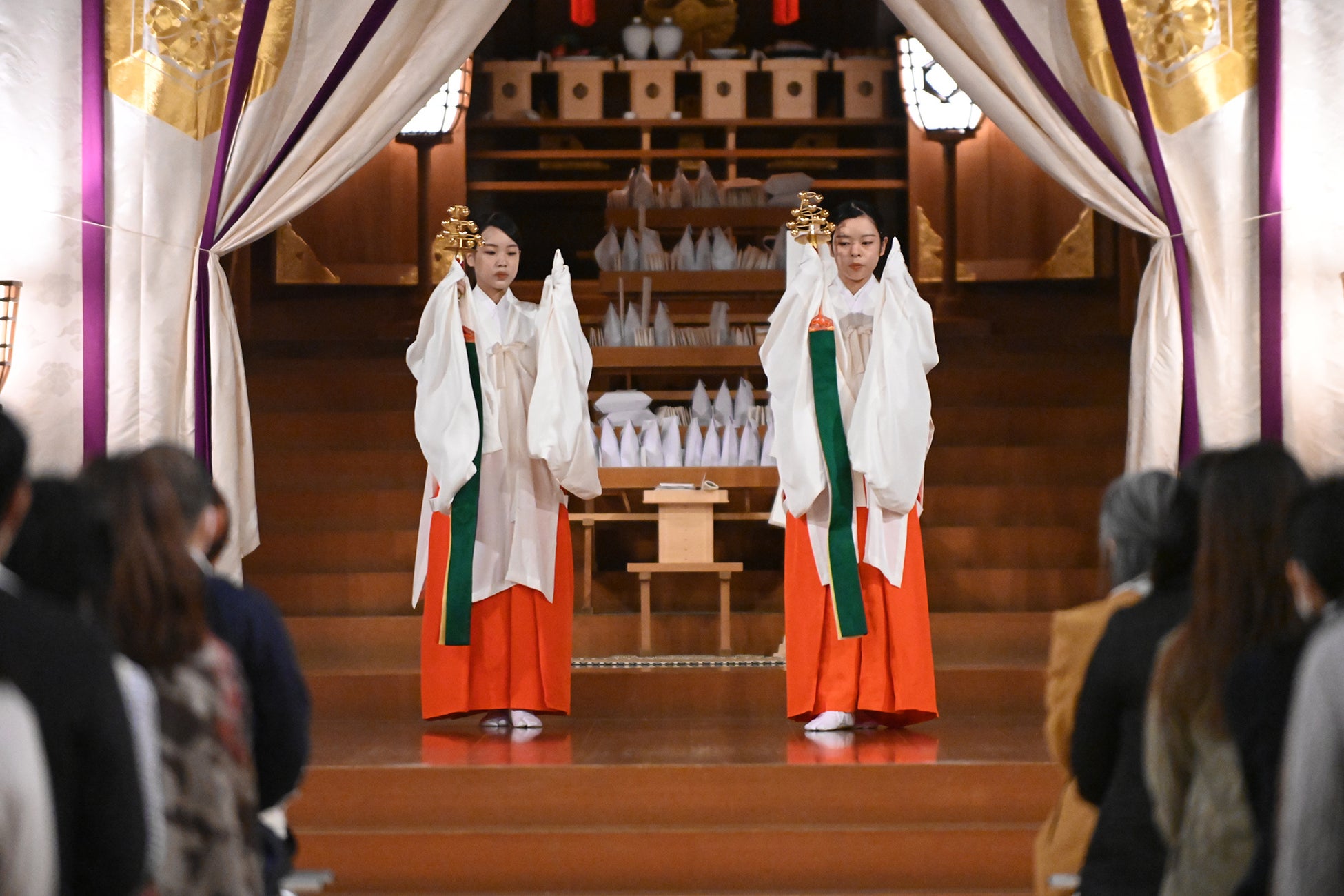 出雲大社神楽殿内で、神職による願意の読み上げ祈祷と巫女による夜神楽奉納によっておまつりをご奉仕され、ご神礼が授与されます。