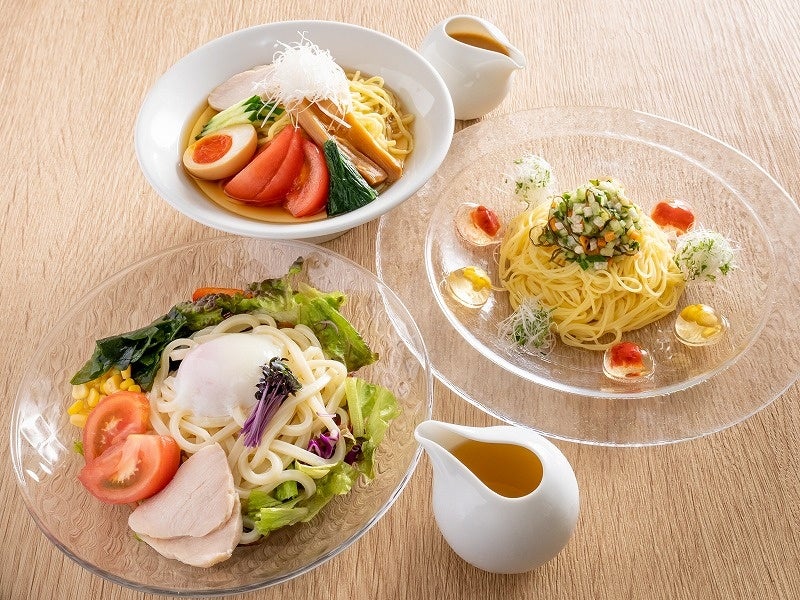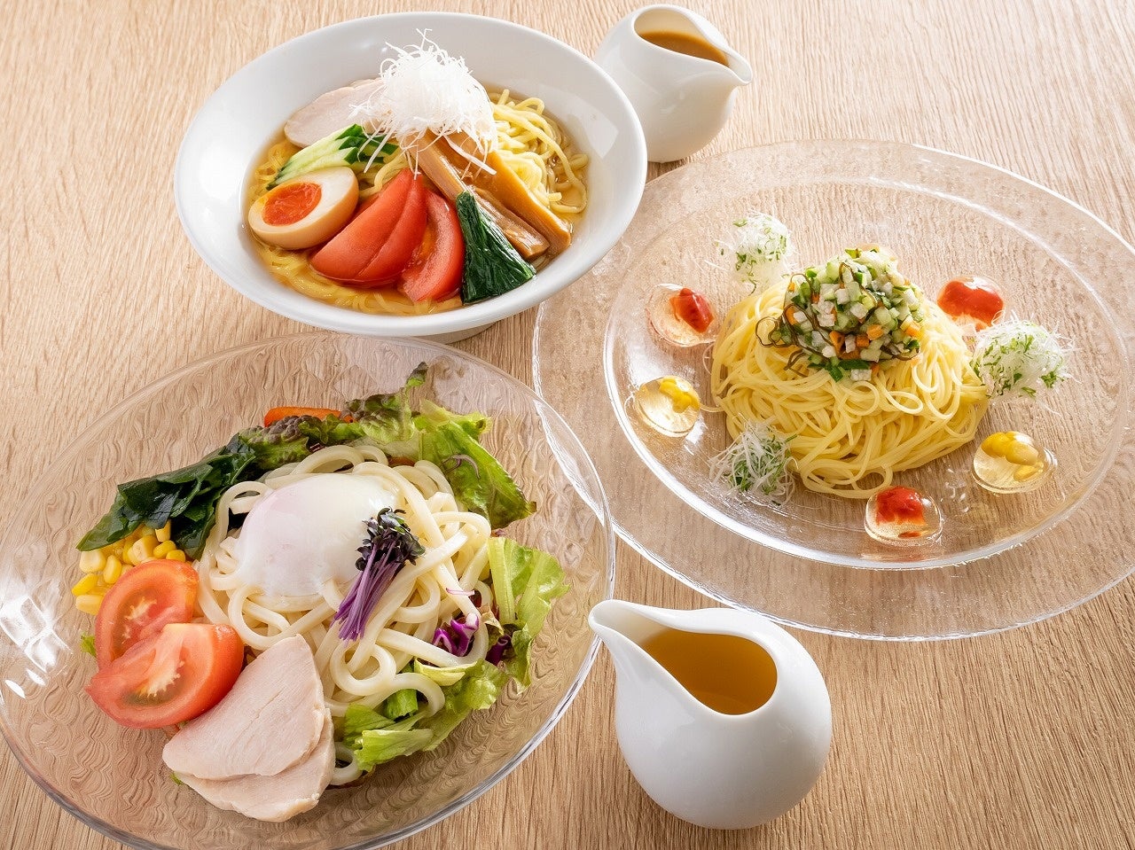 夏の定番郷土料理、山形のだしを使用したさっぱりテイストの冷製パスタ。水分が多い夏野菜に、香味野菜を刻んで和え、味つけした「だし」を使用したオリジナルメニュー。