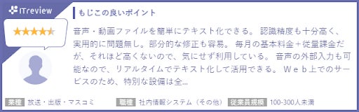 もじこは音声認識の部門で「Leader」を受賞しました。「Leader」は、レビュアーによる満足度評価と市場の認知度を可視化した「ITreview Grid」の中で認知度高く、ユーザー満足度も高い評価の製品に与えられるものです。もじこについて「ITreview Grid」内で、「苦痛から解放された」「業務の効率化・時間短縮に大きく貢献!」「もじおこしの決定版」など、お客様満足度の高いレビューを頂戴しており、お客様から大変ご好評をいただいていたことから今回の受賞に至りました。