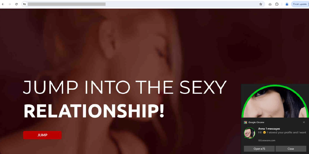 下のスクリーンショットは、ユーザーを詐欺的な出会い系サイトに誘導するよう設計されたプッシュ通知をクリックした後に表示されるランディングページを示しています。このページでは、訪問者に巧みに加入を促し、簡単につながりを持てることや、マッチングの可能性の高さを示すことで、訪問してきたユーザーの仲間探しを巧みに利用しています。このようなページでは、ユーザーの警戒心を解き、登録を促すために、魅力的なビジュアルや説得力のある文言が使用されることが多いため、このようなサイトには安易に信用するのではなく細部まで確認することが重要です。