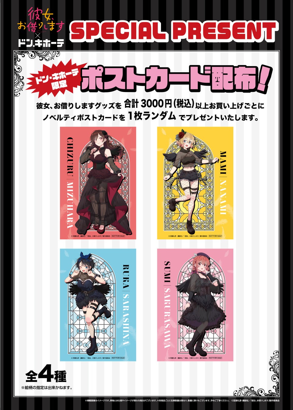 TVアニメ『彼女、お借りします』×ドン・キホーテのコラボグッズを3,000円(税込)お買い上げごとにランダムで1枚プレゼント。