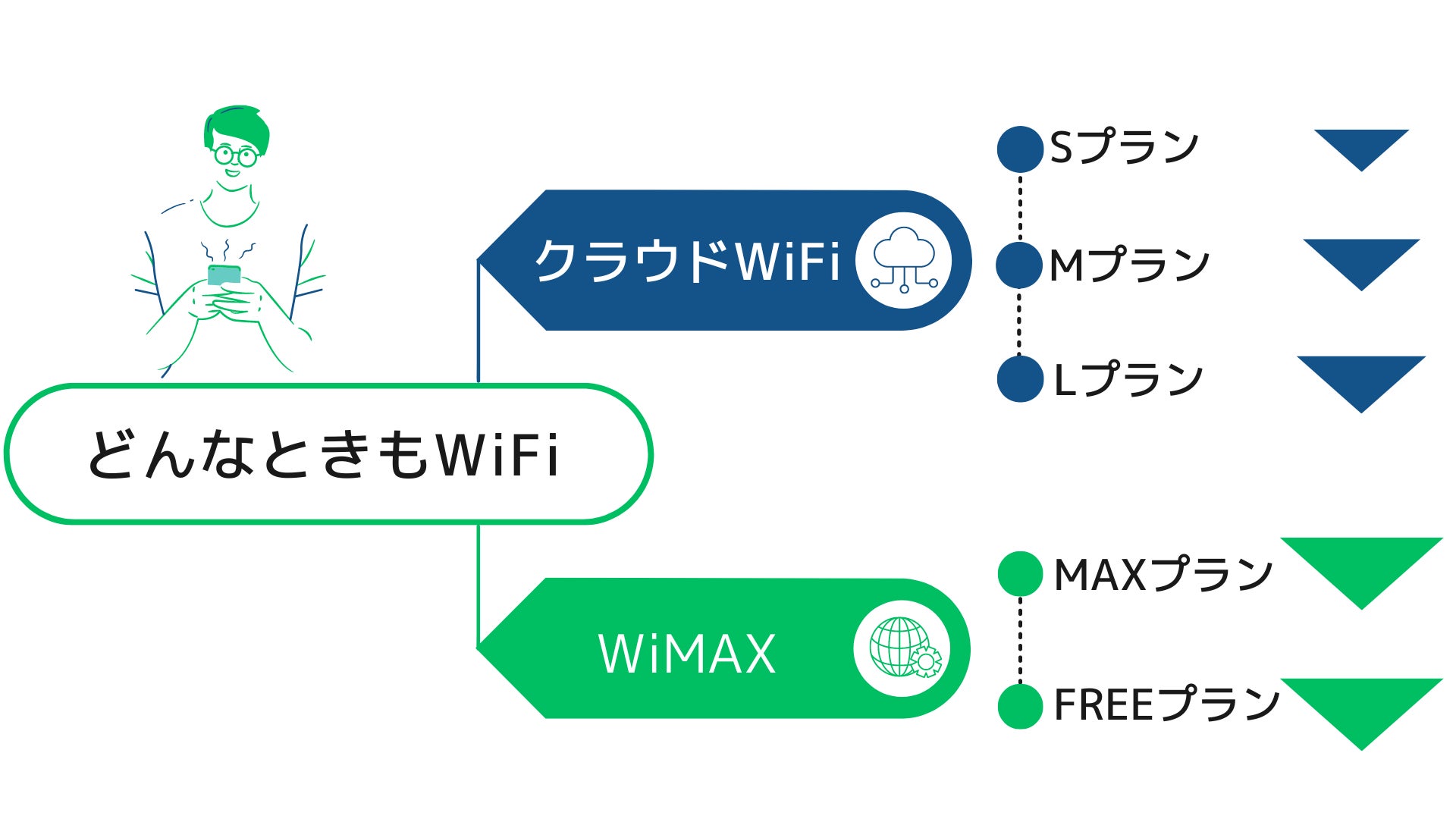 どんなときもWiFiでは、クラウドWiFi・WiMAXの2つのサービスを取り扱っています。使いたい用途や利用シーンに合わせてお好きなサービスをお選びいただけます。