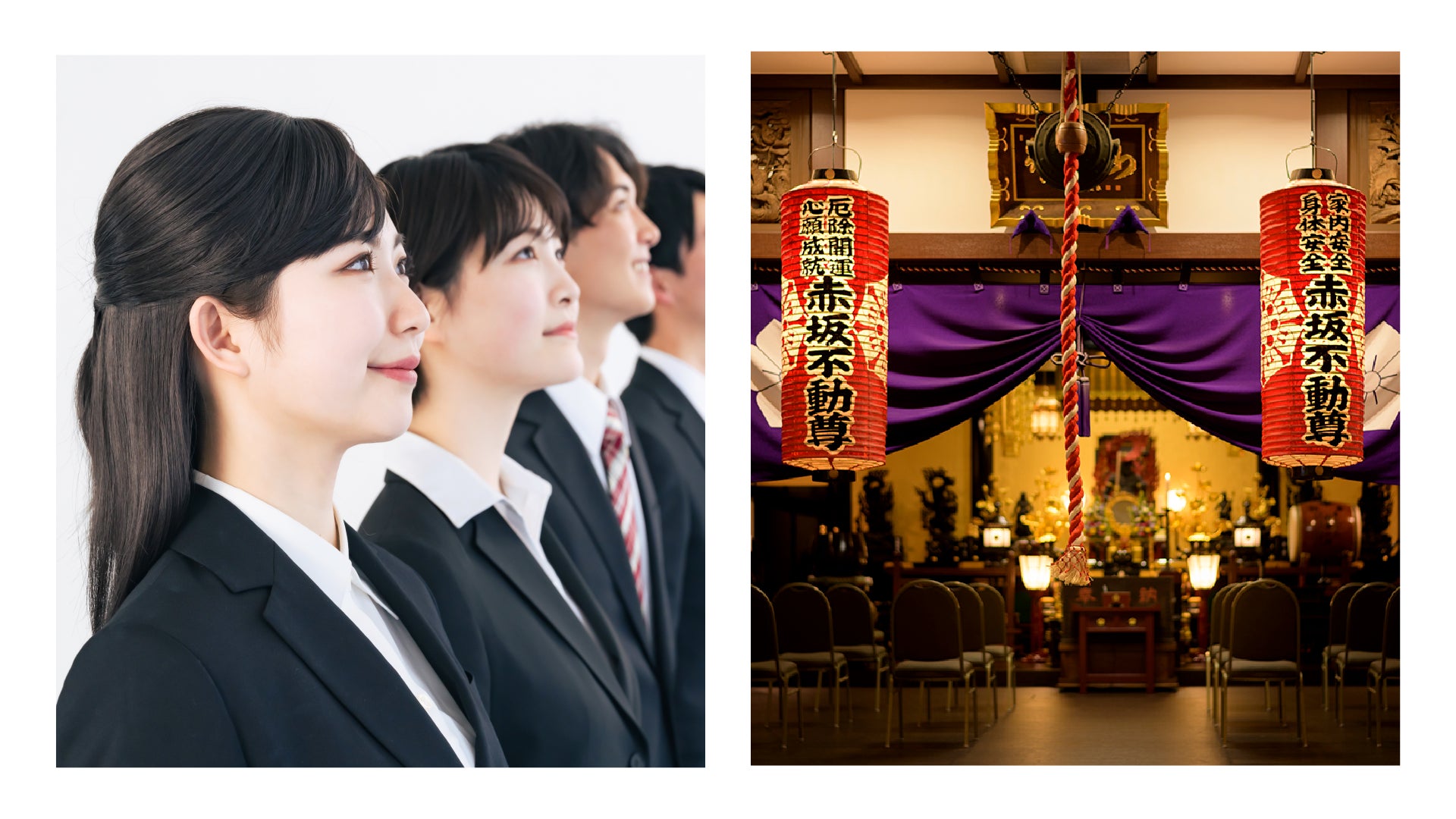 新入社員が、寺院と共にお客様にサービス提供をしていく当社の姿勢を理解する機会として、自動搬送式納骨堂「赤坂一ツ木陵苑」の経営主体である赤坂不動尊威徳寺様のご協力の下で、寺院本堂における入社式を開催するに至りました。