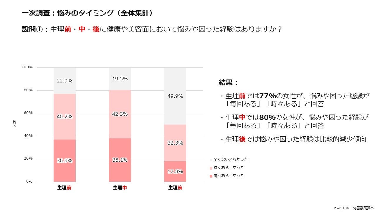 まず、生理期における美容、健康に関する悩みの有無について調査したところ、約80%もの方が生理前や生理中に悩んだ経験があることが確認されました。