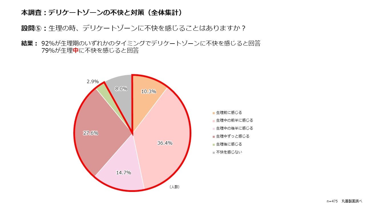 生理の際、デリケートゾーンに不快を感じるかとそのタイミングについて質問しました。その結果、92%の方が生理期のいずれかのタイミングで不快を感じると回答しました。また、79%の方は特に生理中に不快を感じていると回答しました。