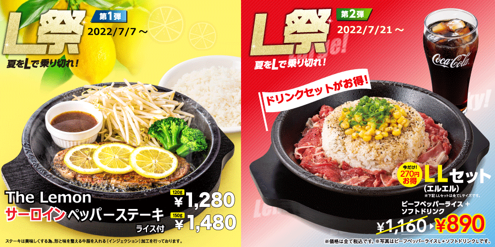 そんな高級部位のサーロインステーキがお得に食べられる「ペッパーランチのL祭り第1弾」を7月7日(木)から開催いたします。第1弾のLは、Pepper Lunchの「L」、Lemonの「L」。第2弾では夏休みにピッタリのお得なメニューも登場予定です!第2弾の「L」もご期待下さい!