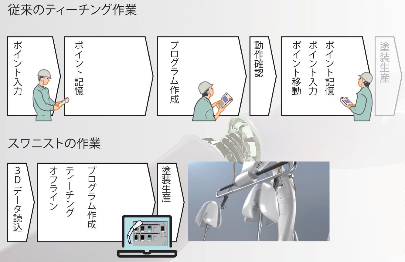 独自開発のソフトウェア「SWANIST」を使用することで、塗装ロボットのティーチングをより簡単にできるようになりました。従来は作業者がロボットの前に立ち、各ポイントを入力しプログラムを作成する必要がありましたが、「SWANIST」ではバーチャル空間上にてロボットのティーチングを行うことも可能となりました。