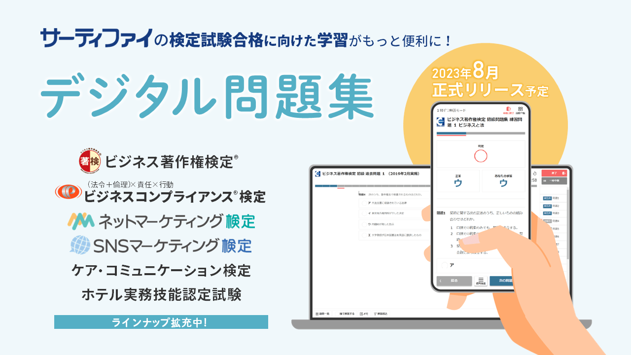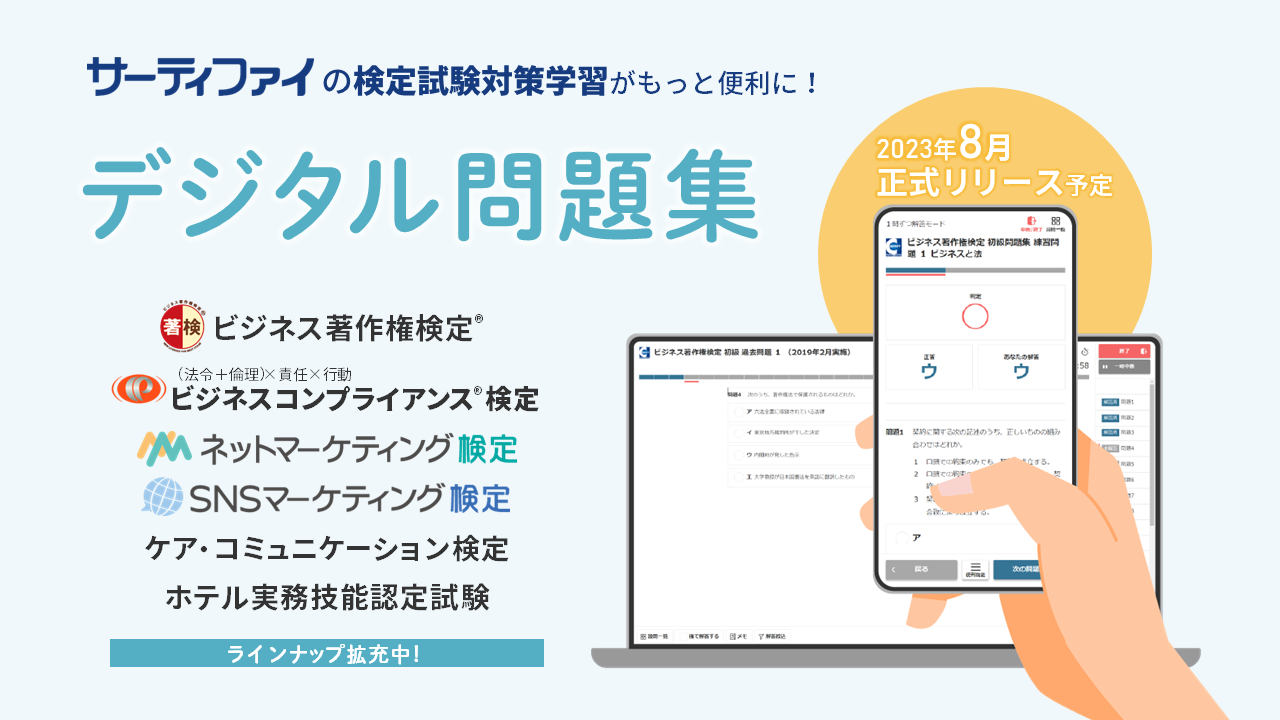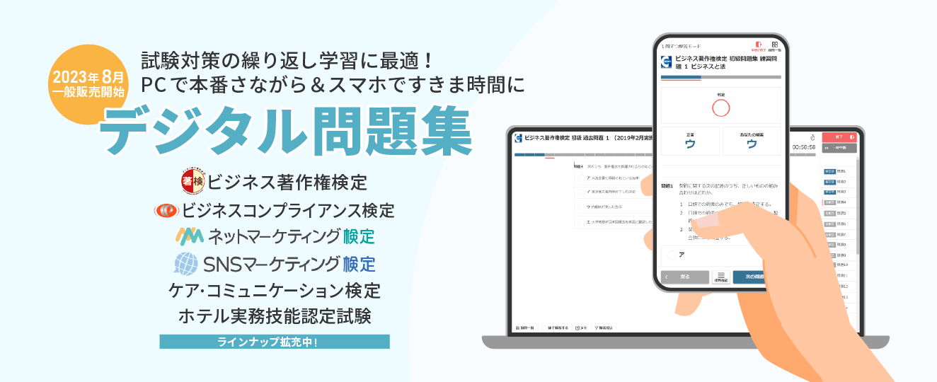 ラインナップ | ビジネス著作権検定 問題集 ビジネスコンプライアンス検定 問題集 ネットマーケティング検定 問題集 SNSマーケティング検定 問題集 ケア・コミュニケーション検定 問題集 ホテル実務技能認定試験 問題集 |