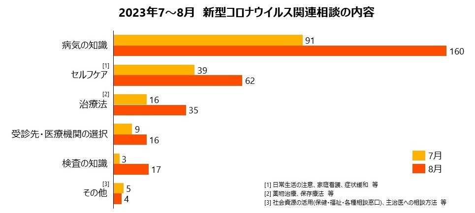 新型コロナウイルスに関連する相談の内容は、病気に関する基礎知識が最も多く次はセルフケアについて。8月になると、治療法や検査の知識、受診先や医療機関に関する相談も増加傾向に。