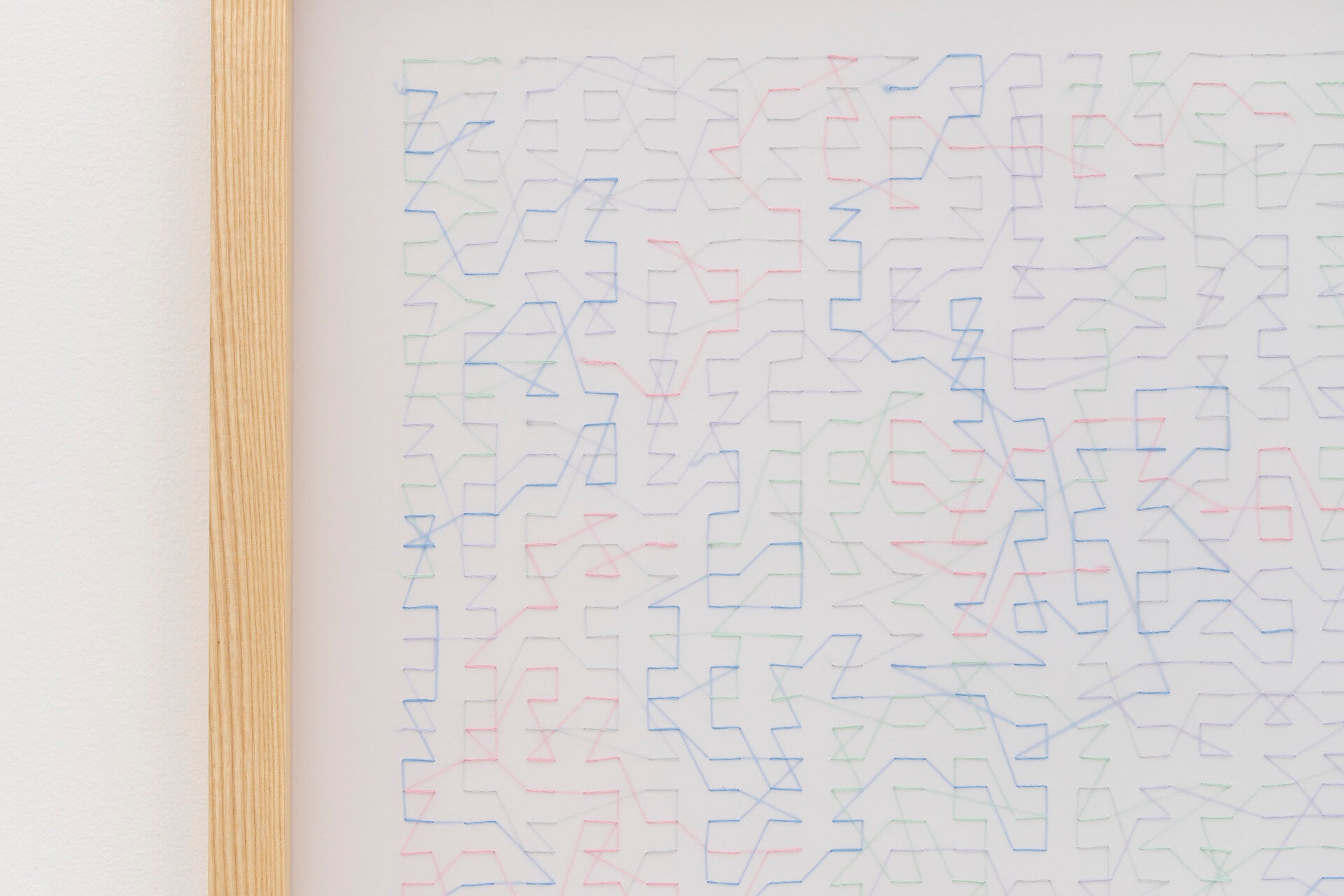 ・直線を反復して描くことによって方眼紙のようなイメージを描き出すシリーズ「スフ」、刺繍の線が紙の表面・裏面を行き来する「表と裏のためのドローイング」と併せ、新作のビーズによるドローイング「Rim」を展示。
