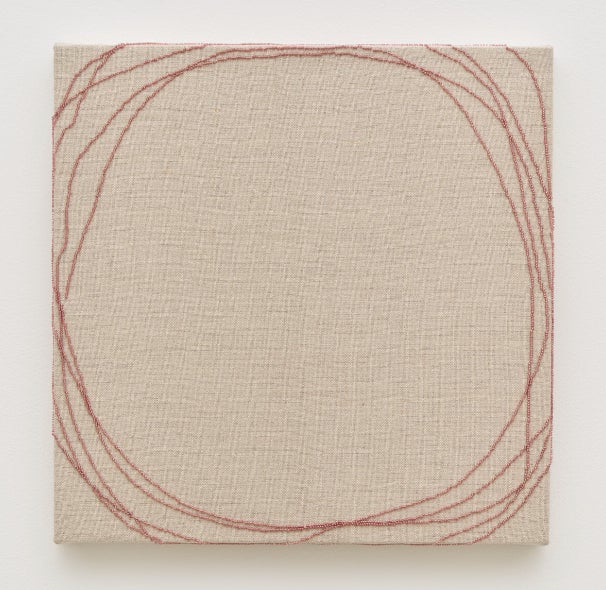 キャンバスに、ぐるりと曲線を描き、縫い付けられたビーズは、厚みのあるフレームに取り付けられることで、絵画平面の枠組みを軽々と乗り越えて行き、「移ろいやすい、普遍性」の中をわたしたちが泳ぎ回っているのだということを鮮やかに示しています。
