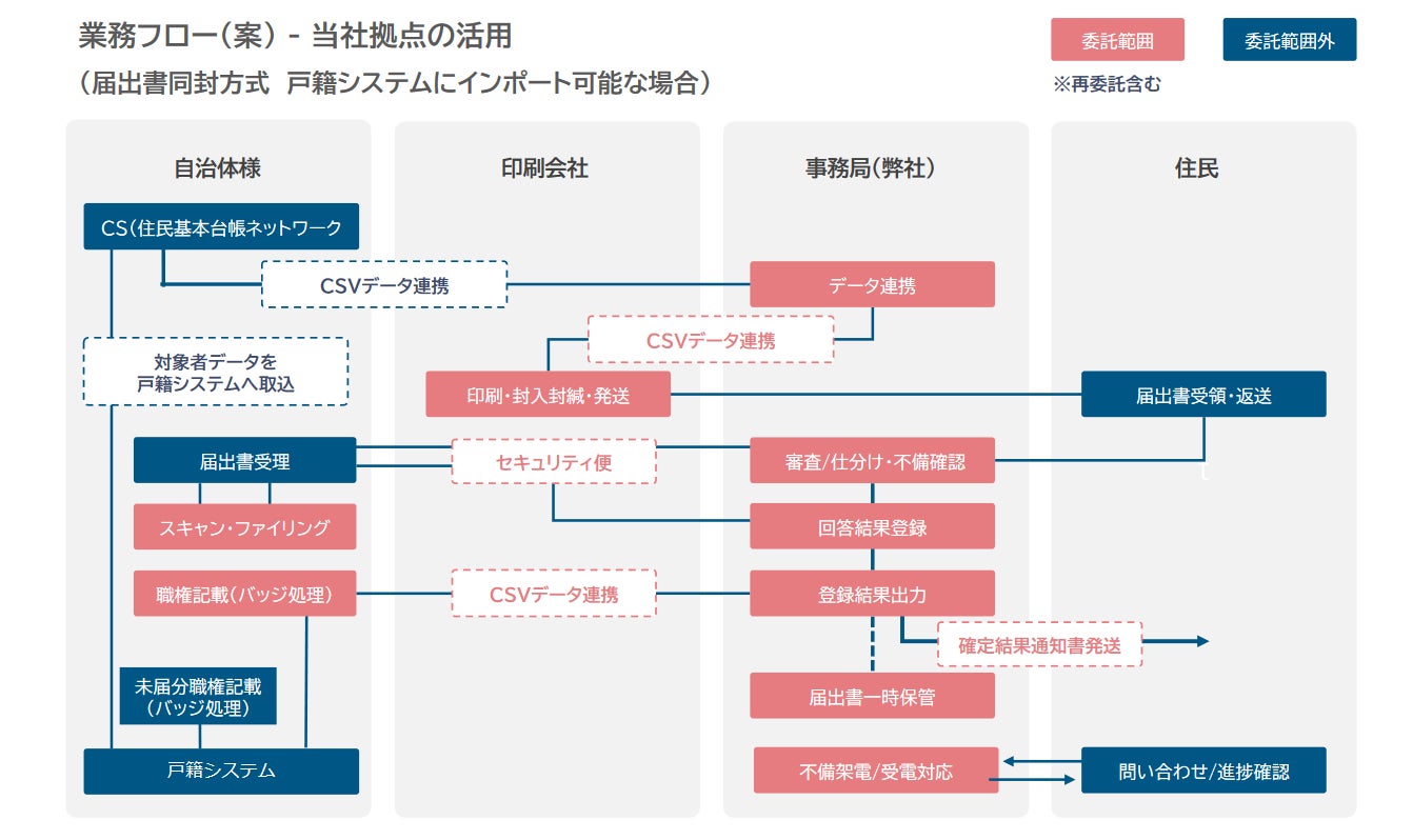 綜合キャリアオプションが提供する「戸籍フリガナ登録サービス」は、戸籍法改正に伴う自治体業務を業務企画・設計段階から支援し、自治体と住民の間に発生する連絡事務手続きを円滑に代行します。