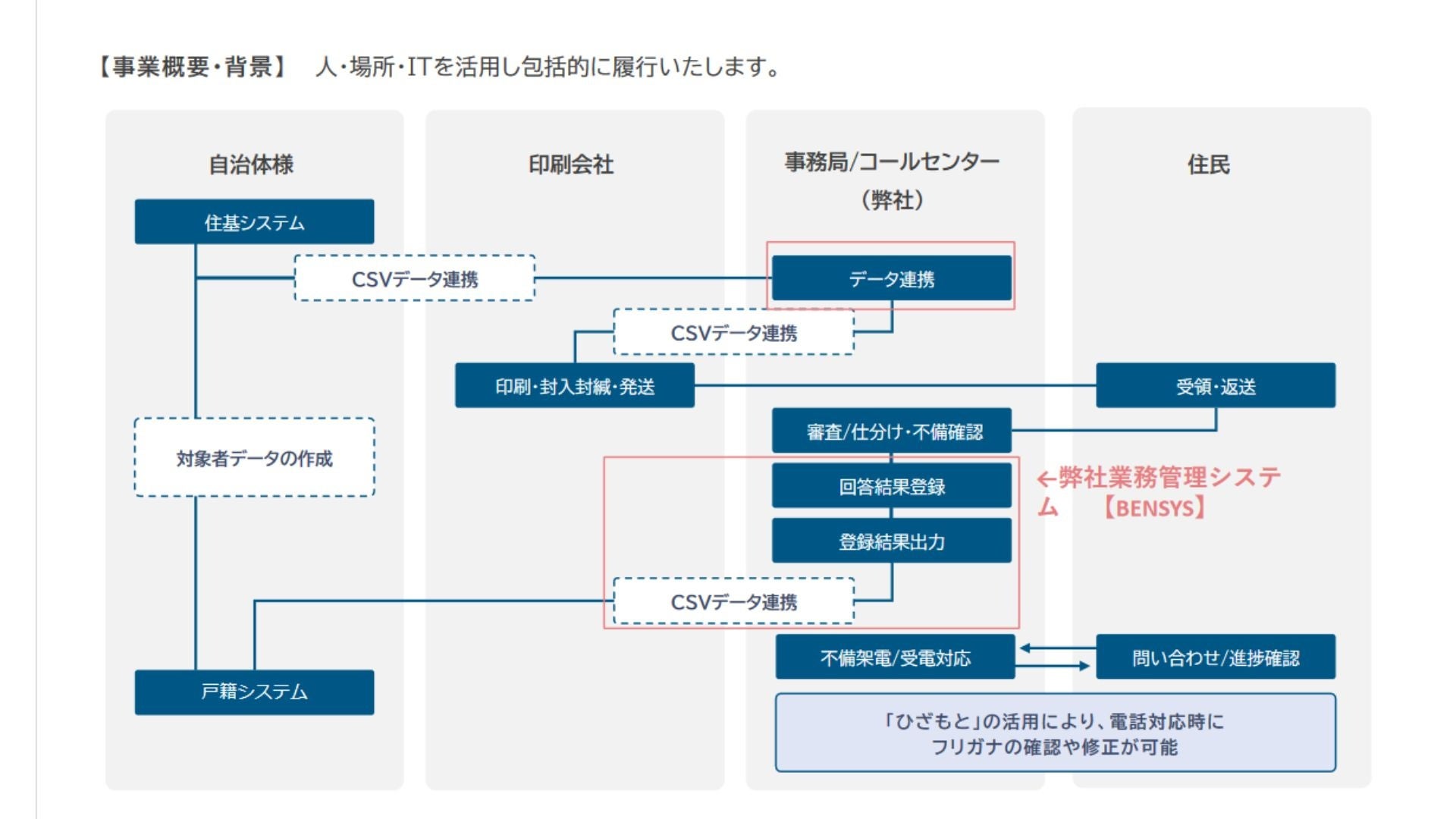 また、待ちの姿勢になりやすい届出受付業務を、BPOによって行政サービスをサポートするプッシュ型支援パッケージ「ひざもと」を活用してより積極的に届出促進を行います。電話面談からWEB入力を誘導することで、行政サービスの品質と効率を向上します。