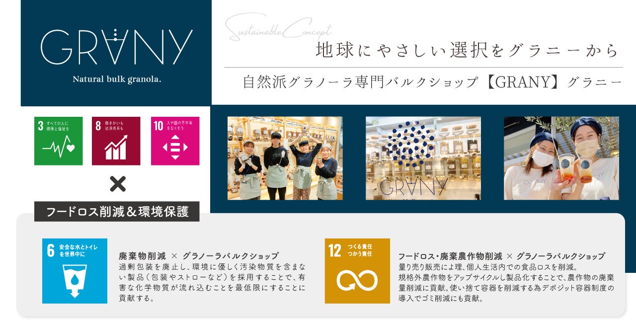 GRANYで行うグラノーラショップでは、環境問題への貢献、フードロス削減への貢献、廃棄農作物のアップサイクルや地域再生など様々な社会課題をミッションとしています。
