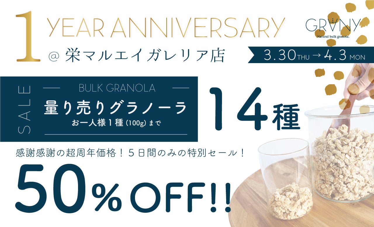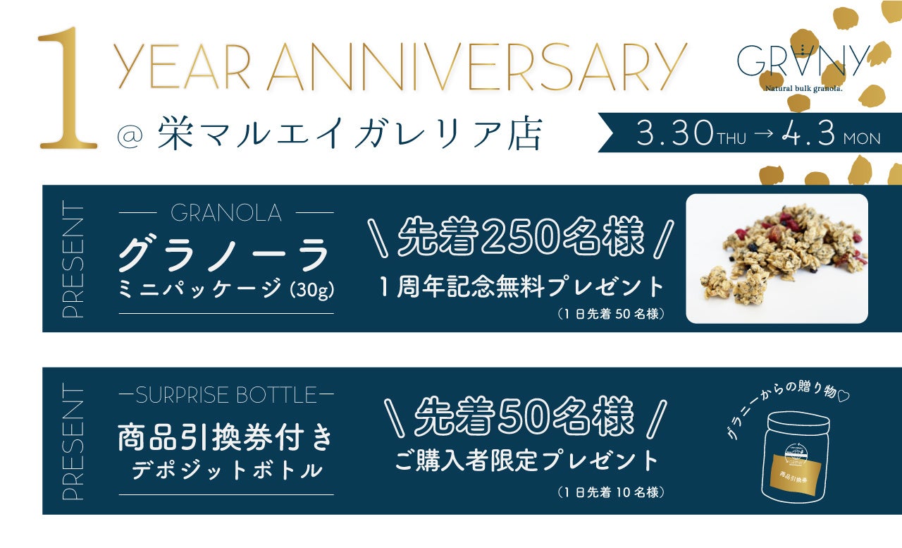 昨年3月31日(木)名古屋市中区3丁目「丸栄百貨店」跡地に開業した商業施設『Maruei Galleria (マルエイガレリア)』1階にて、障がい者就労支援で運営する、社会課題解決型・ナチュラルグラノーラ専門バルクショップ&カフェ【GRANY(グラニー)】としてオープンして一年。お客様、皆様の温かい応援をいただき1周年を迎えることとなりました。