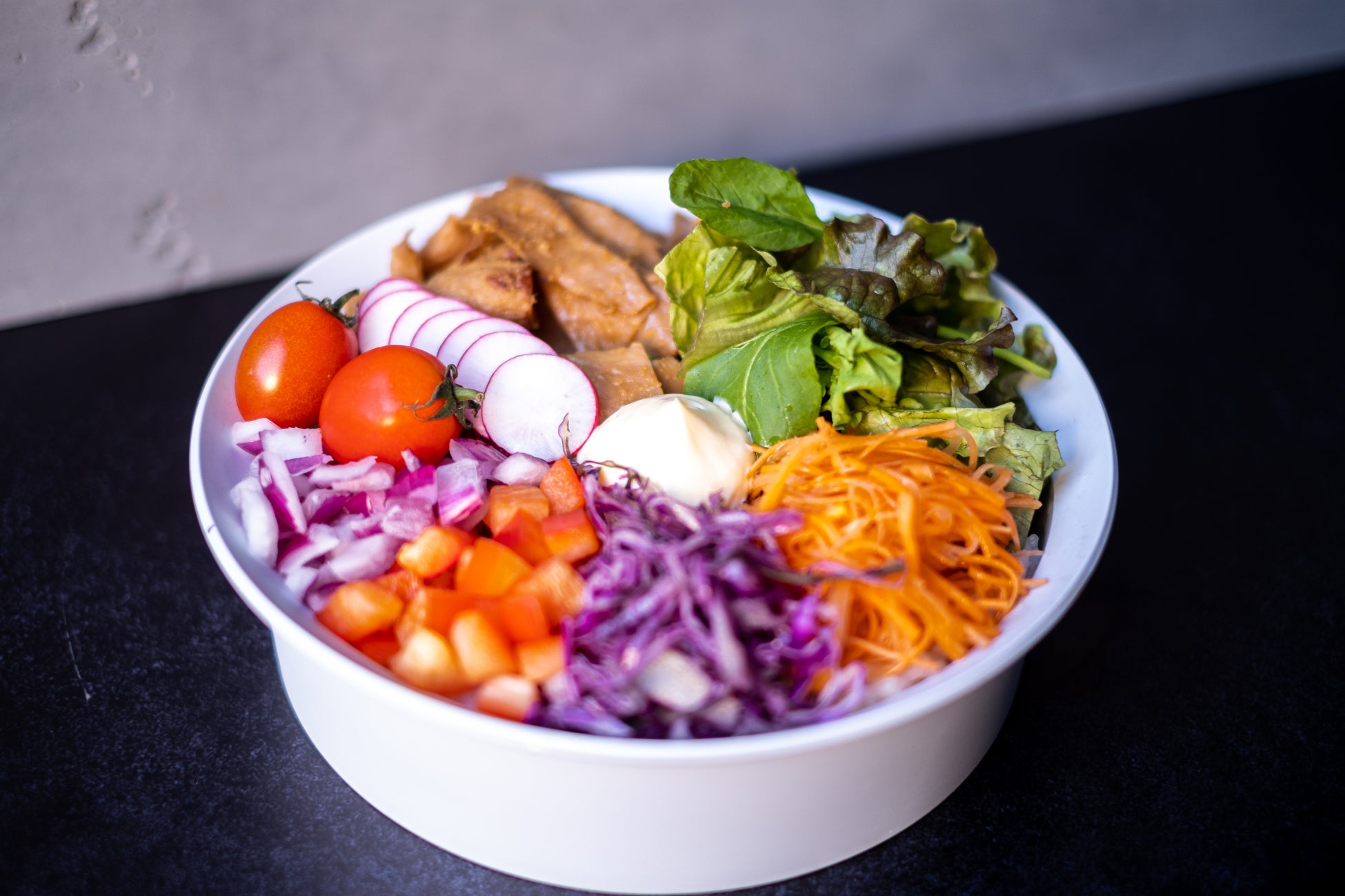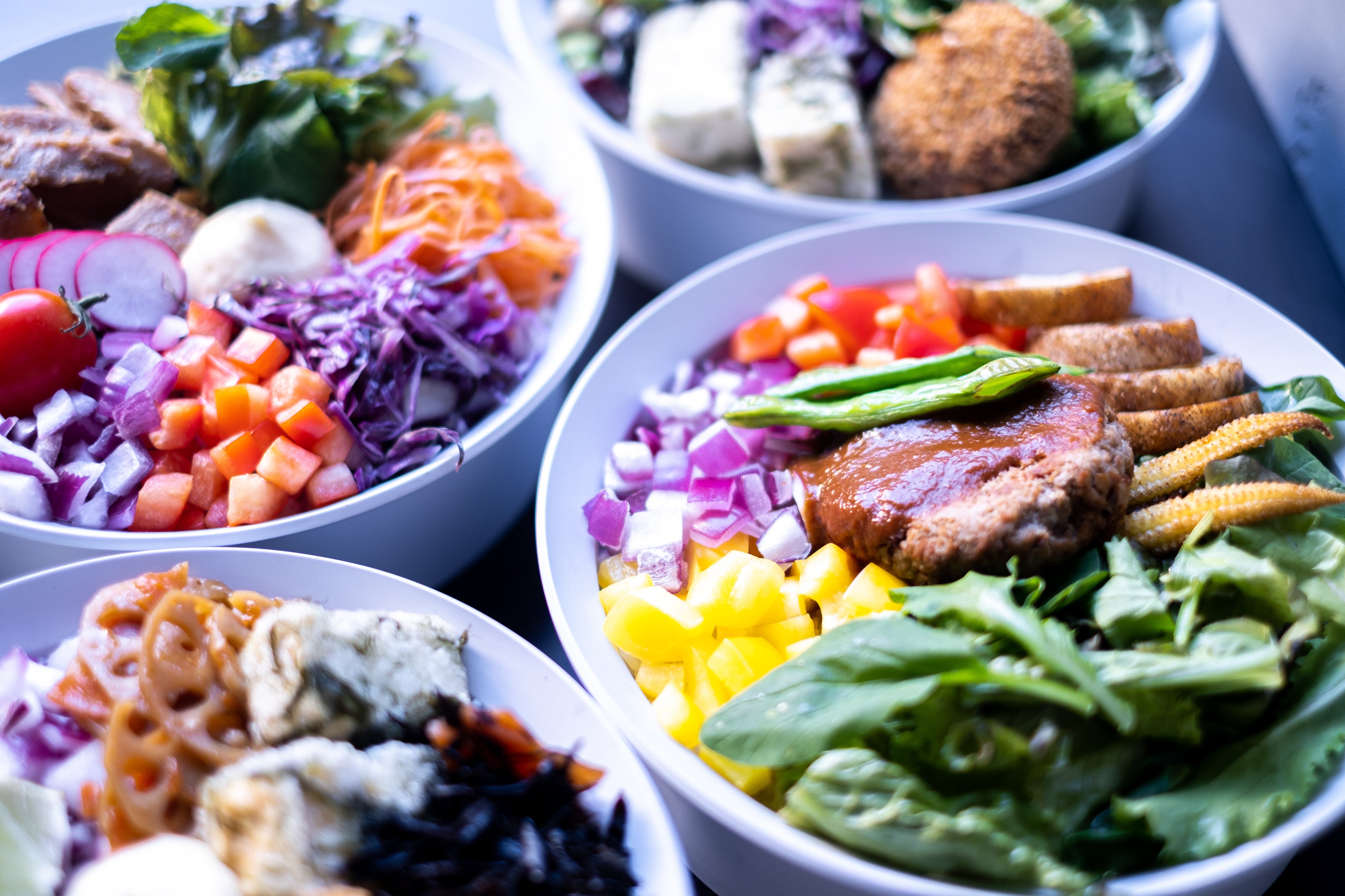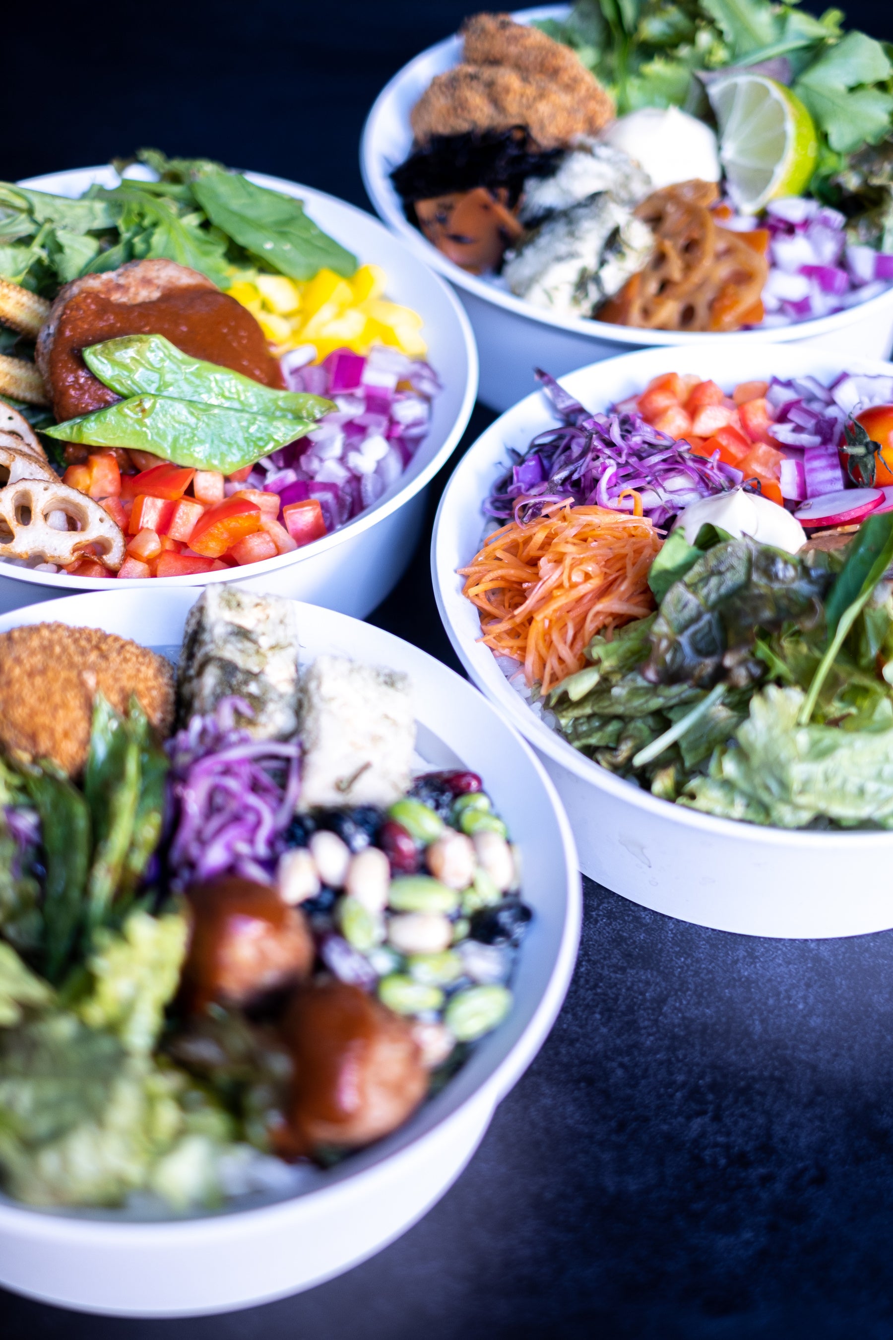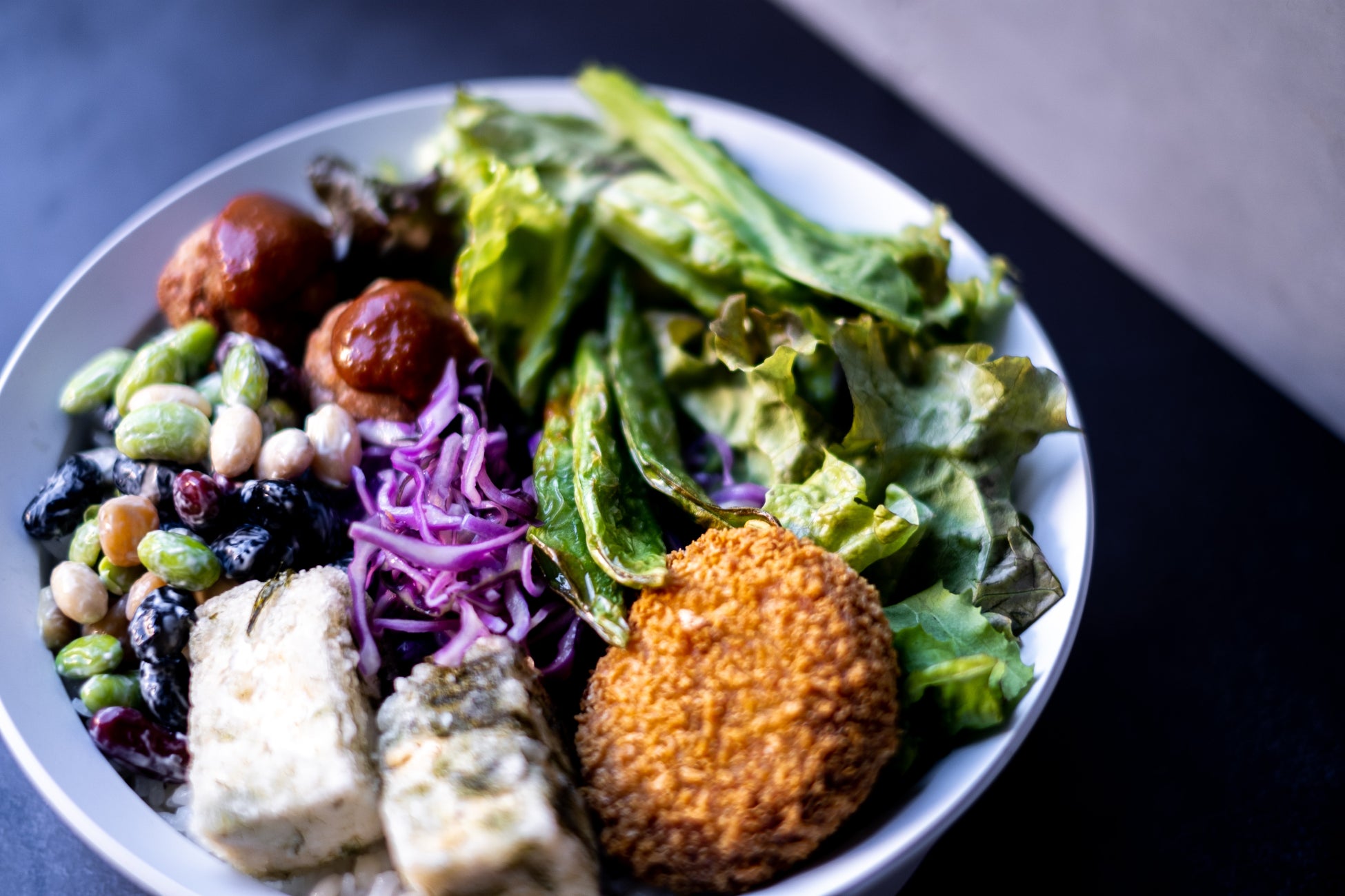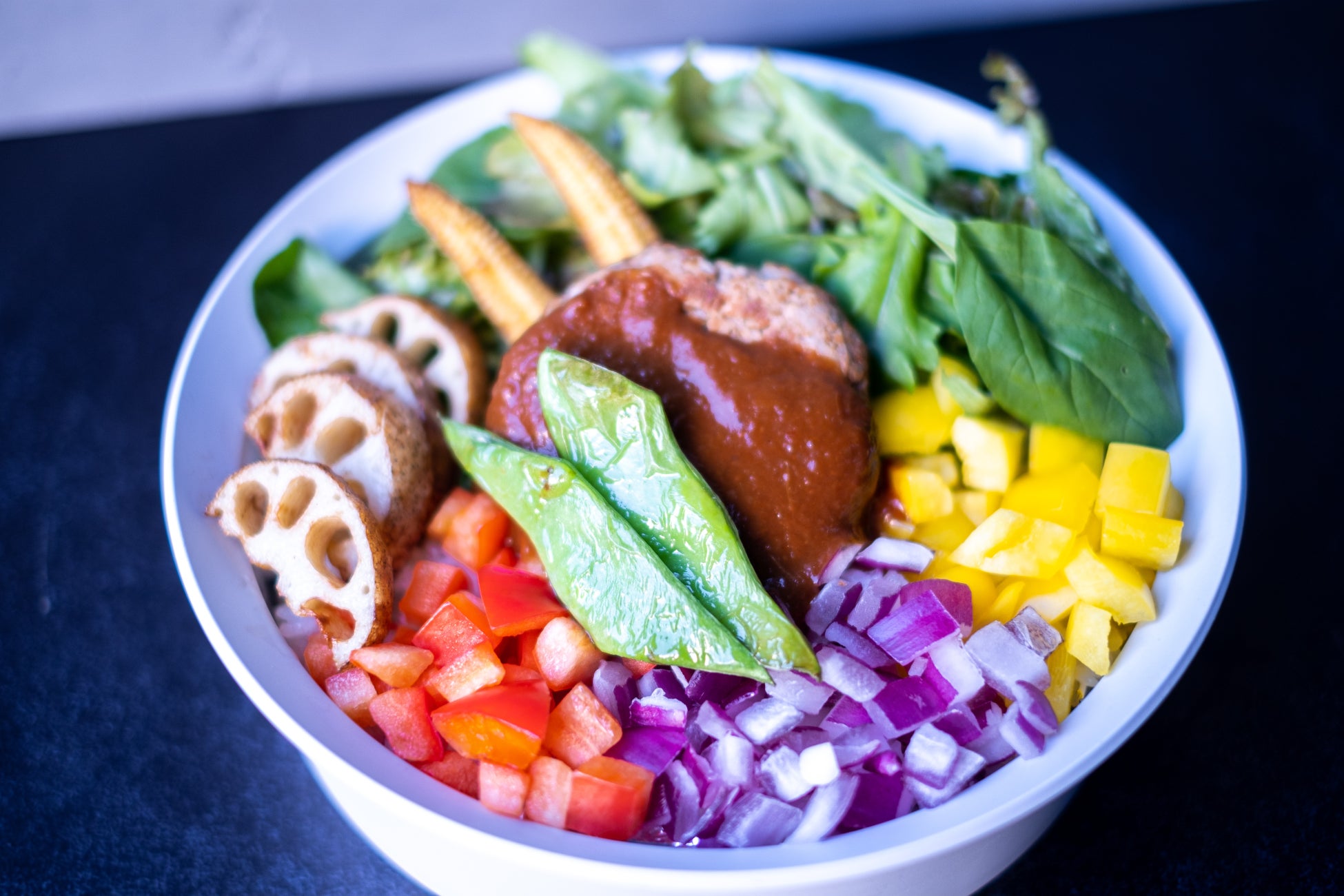 国産大豆ミートのハンバーグ、グリル野菜、サラダをご飯の上に載せたヴィーガンボウルです。ハンバーグは大豆ミート本来の美味しさを引き立たせるため、具はシンプルに蓮根のみを使用。ブラックペッパーをきかせ、最低限の調味料で作り上げています。