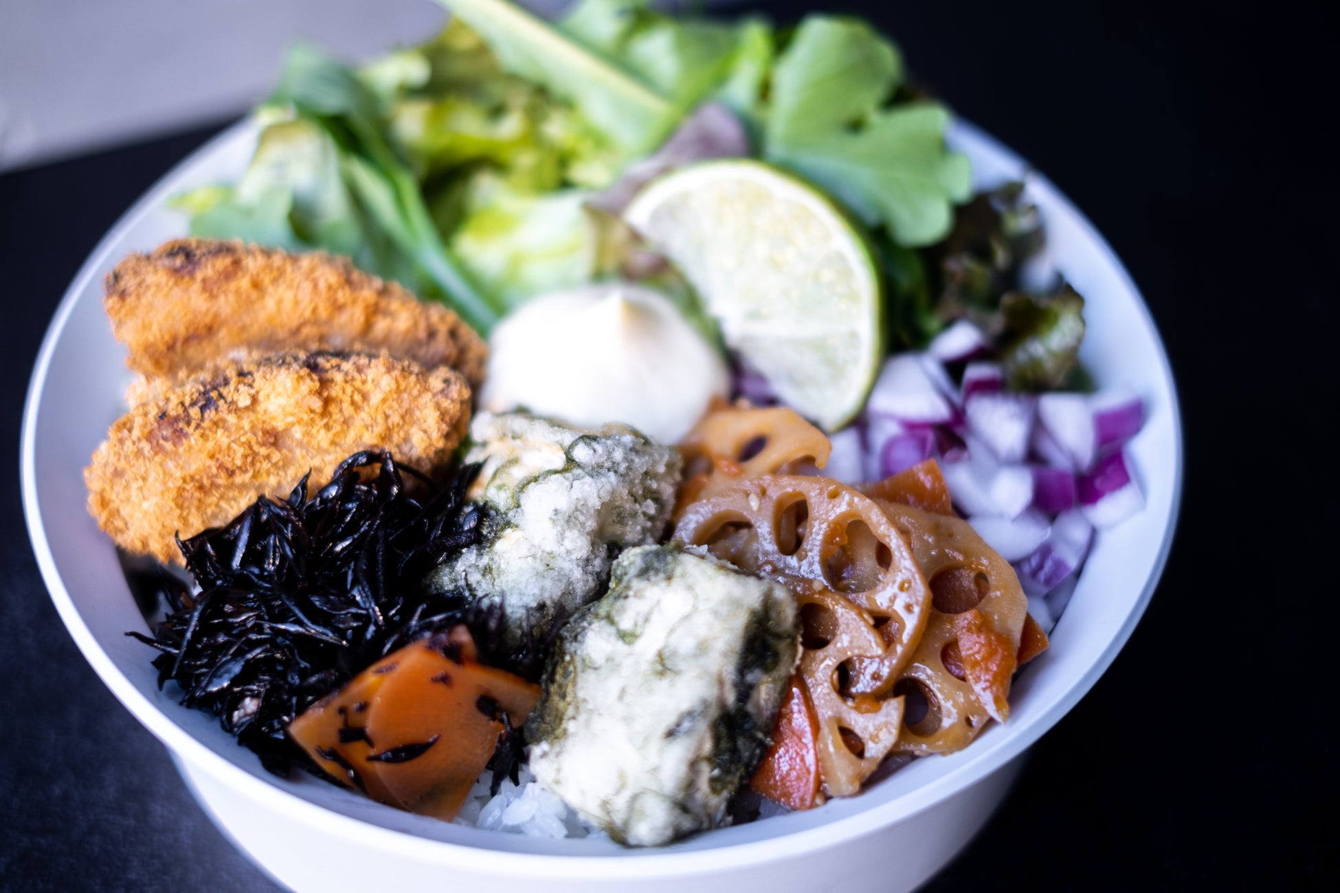 豆や野菜のサラダ、蓮根のきんぴら、ひじきの煮物などのお惣菜、車麩のフライや豆腐の糸あおさ揚げ出しなどの揚げ物をご飯の上にのせたヴィーガンボウルです。お好みでヴィーガンマヨネーズや柑橘果汁をかけてお召し上がりください。