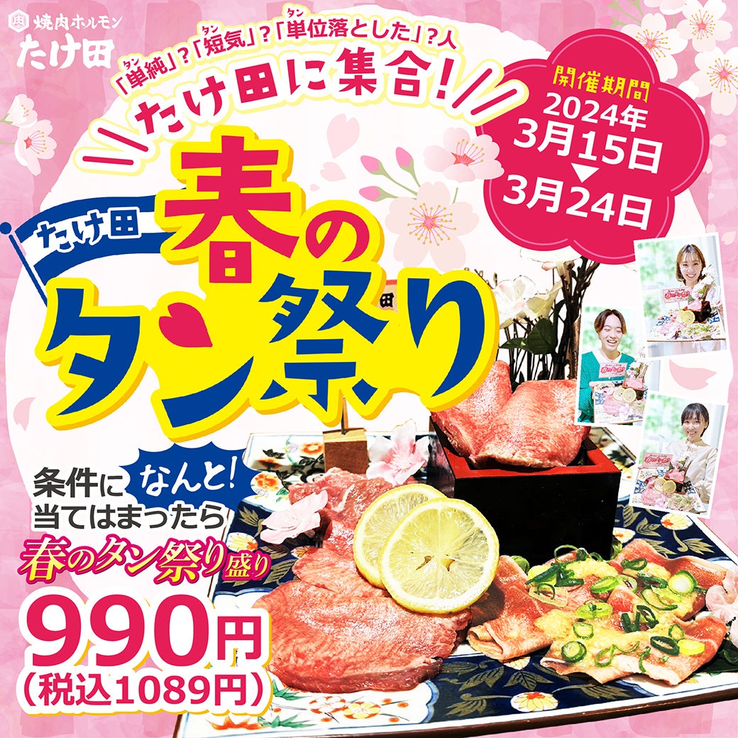 ⿊⽑和⽜A5を気軽な価格で。おいしい和⽜カルビや炊きたてツヤツヤ⽻釜ごはんなど、本物の⾷体験を⾼級店の半額で楽しめる⼤衆焼⾁ブランド「焼⾁ホルモンたけ⽥」を運営する株式会社ミナモト(代表取締役:細⽥源太)は、3月15日~24日の10日間≪春のタン祭り≫キャンペーンを実施いたします。