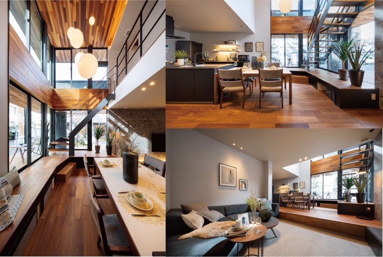 モデルハウス内は、ニューノーマル時代に対応しうる動線計画で、ご家族がそれぞれのスタイルでくつろいでいただけるLDK空間、大開口サッシと自然素材に包まれた吹抜空間、落ち着いた印象の色彩構成とともに自然の中に身を置いたようなインテリアイメージで構成しております。