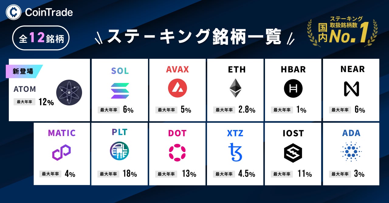 また、「CoinTradeStake(コイントレードステーク)」でコスモス(ATOM)取り扱い開始により全12銘柄でステーキングサービスを提供することとなりました。これにより国内業界最多のステーキングサービスとなり、様々な暗号資産を使った新たな資産運用が可能となりました。