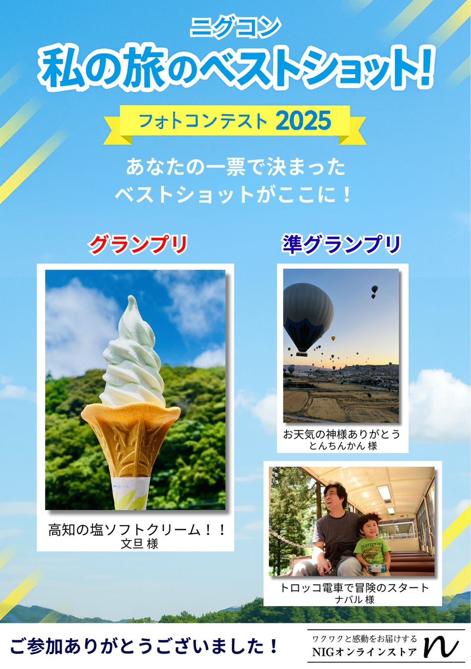 ありそうでなかった製品を通してワクワクと感動をお届けするを運営する合同会社NIG(本社:茨城県石岡市、代表:佐々木 亮人、以下NIG)が運営するNIG(ニグ)オンラインストアは、旅好きユーザーと一緒に作る参加型コンテスト「ニグコン」第2弾として、フォトコンテスト『私の旅のベストショット!』を2025年7月に開催し、その結果が8月13日に発表されました。