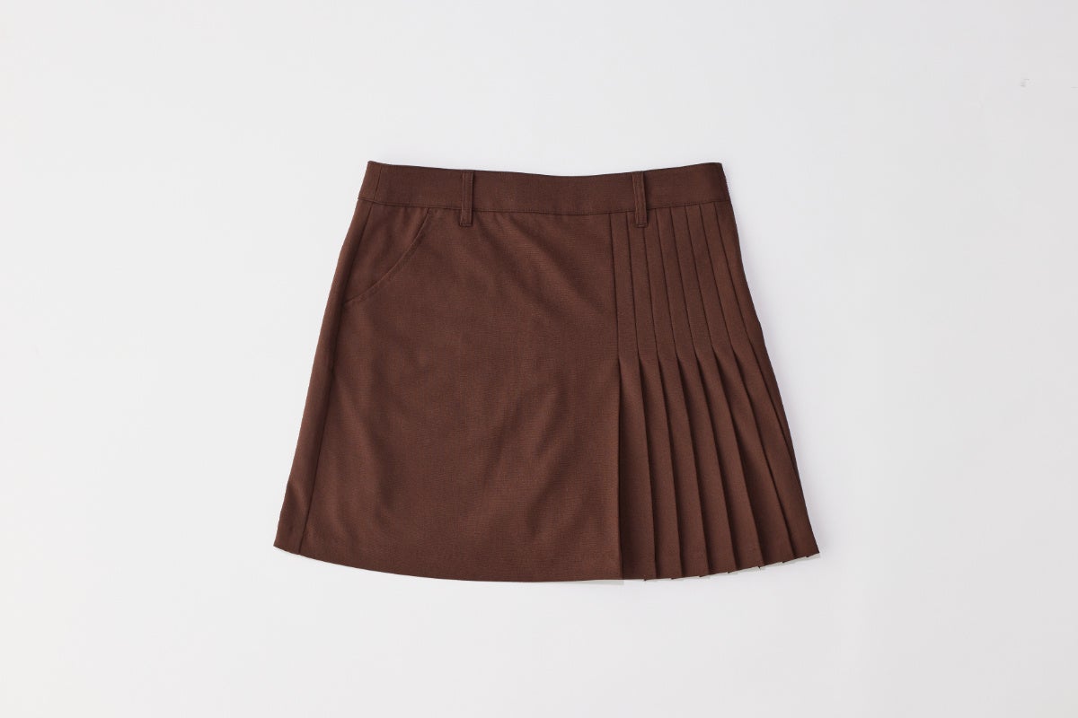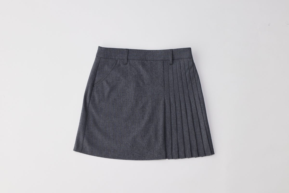 アシンメトリーに入ったプリーツが、控えめな揺れ感を生み出すスカート。動きに合わせて上品に広がり、シンプルながら印象的なシルエットを演出します。