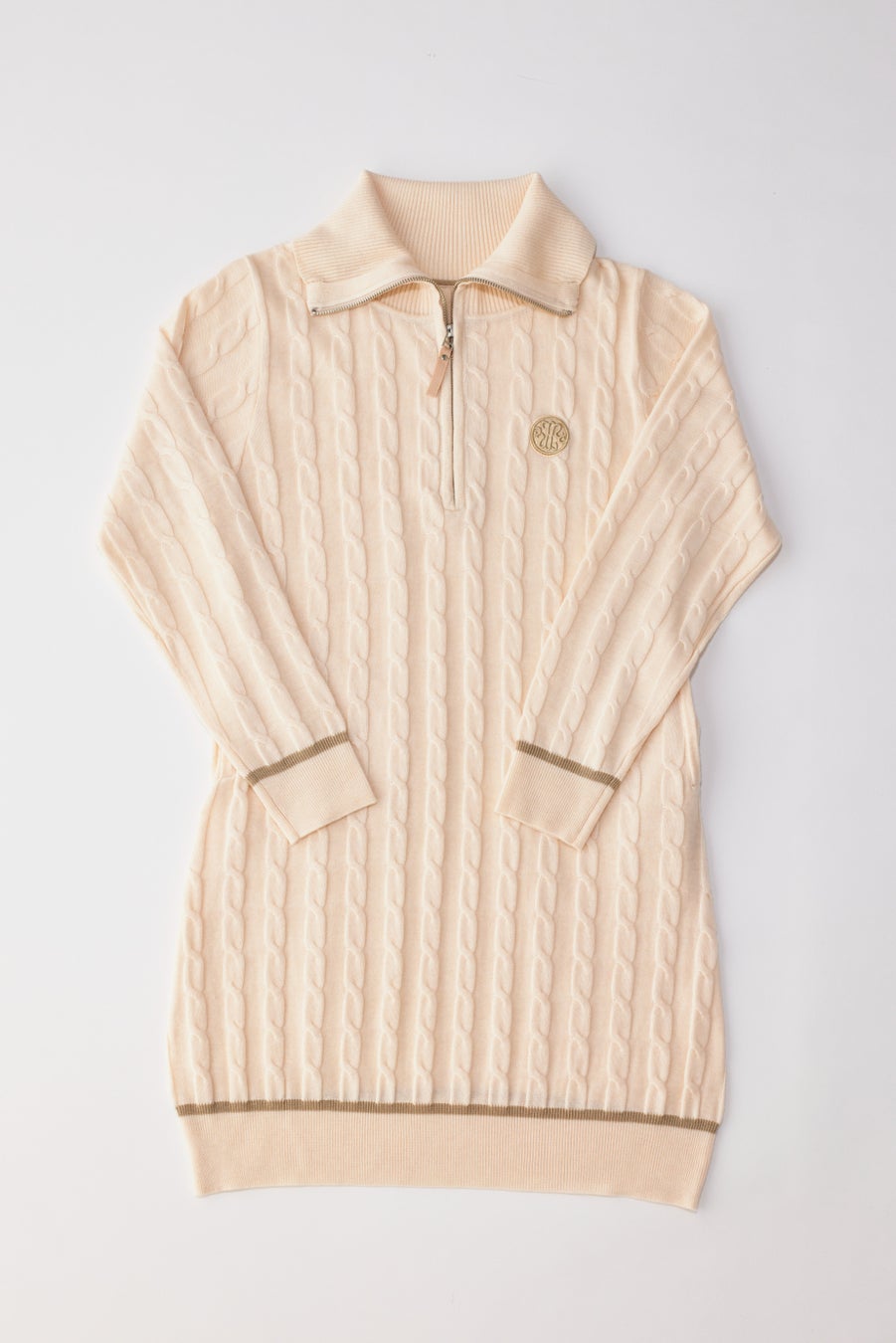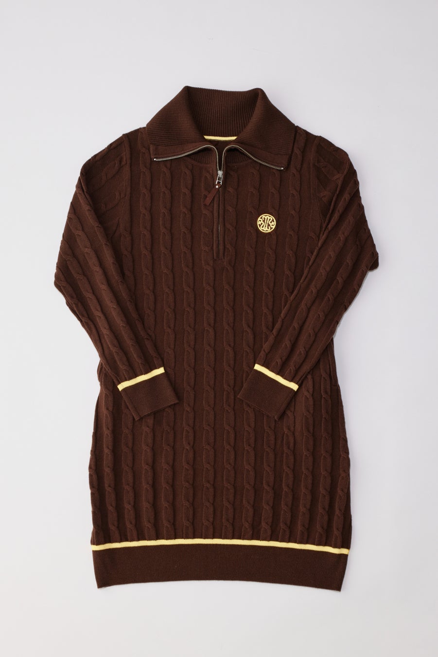 ウール混素材を使用した、あたたかみのあるケーブル編みのニットワンピース。首元はハーフジップ仕様で、着こなしにスポーティなアクセントをプラスします。