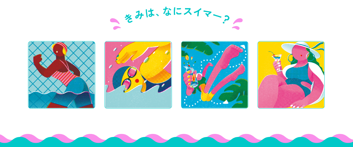 プールにさまざまなタイプの施設があるように、スイマーにも十人十色のキャラがあるはず。そう考えた私たちは、“#きみもスイマー”と題して、ユーザーの好みやスタイルを可視化する「スイマータイプ診断」を企画、公開しました。