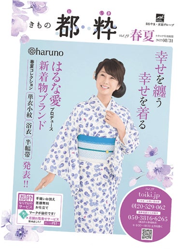 表紙を飾るのは“はるな愛”さん。「きもの都粋」に新たに誕生した💕「haruno」は、はるな愛さんプロデュースの新作ブランド。大人カワイイをテーマに、単衣小紋・浴衣、そしてリバーシブル半幅帯がラインナップ!