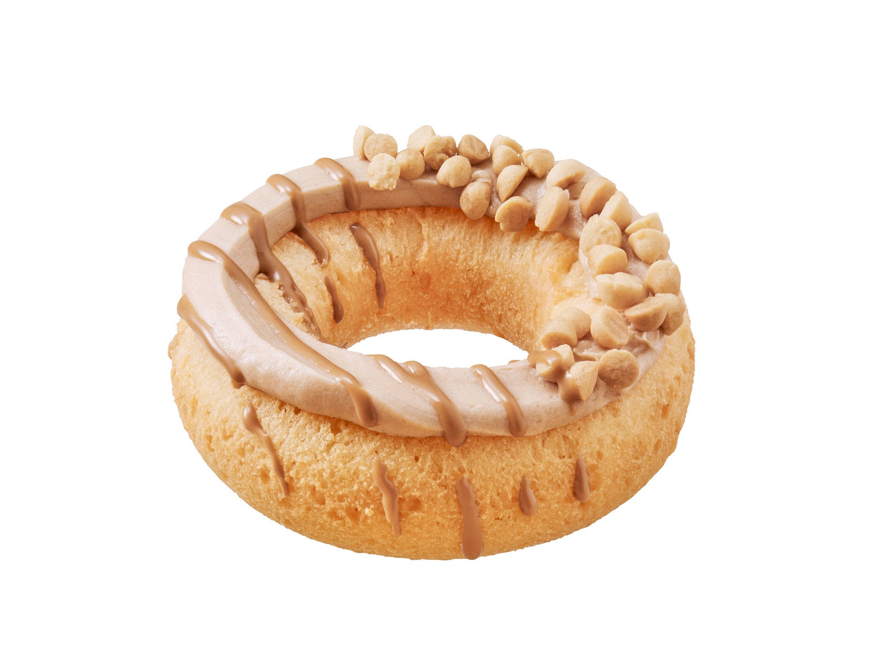『ムチモチ メープル カナダ』は、カナダの国旗にも描かれている名産品「メープル」をイメージしたドーナツです。メープルソースを練りこんだほんのり甘いムチモチ生地に、香り高くコクのあるメープルクリームをぐるりと絞りました。キャラメルチョコをストライプ状に飾り、粒状のキャラメルビスケットをトッピングすることで、ザクザク食感を添えています。