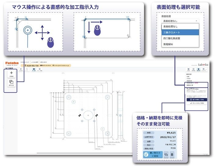 生産器材ECサイト「フタバオーダーサイト」のプレート見積よりご利用いただけるサービスで、任意の二次加工をブラウザ上で簡易的にご指定、調達できるサービスです。加工入力の後、見積り金額が即時に算出されます。
