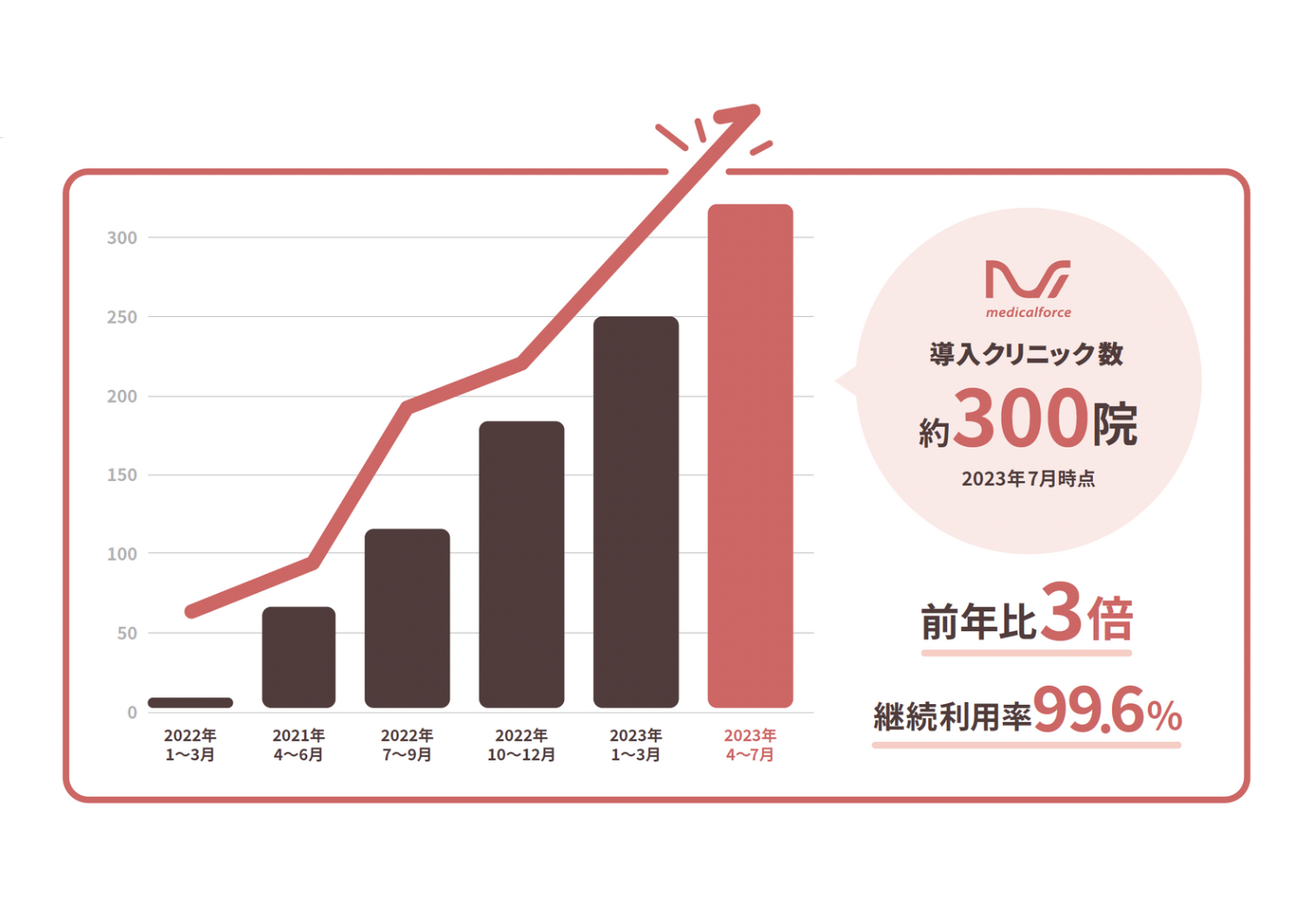 これはmedicalforceのサービス提供開始から2年4か月、また250院突破からわずか2か月での300院達成となり、高い水準での成長を実現しております。自由診療クリニックにとってスタンダードなSaaSになりつつある中で、引き続きプロダクトサービスの利便性の追求、お客様サポート体制の強化、UI/UXのさらなる改善を実施し、「medicalforce」を通して、自由診療クリニックの現場のみなさま⼀⼈⼀⼈の⽇々の業務のDXと、患者さまの体験の向上の実現に貢献してまいります。