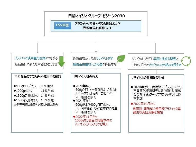 2021年度からスタートした「日清オイリオグループビジョン2030」では、CSV 目標として、プラスチック容器・包装の削減と資源循環の推進を掲げ、①プラスチック使用量の削減、②リサイクル材・植物由来素材の利用推進、③リサイクルの仕組みの整備、を柱に取り組みを進めています。