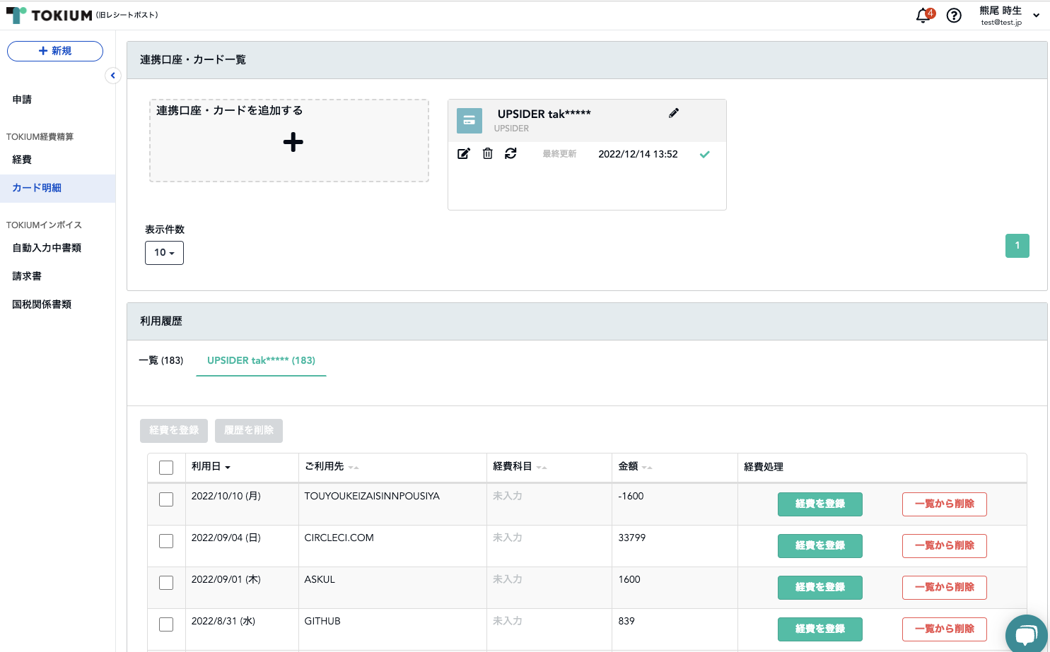 今回のデータ連携によって、経費精算クラウド「TOKIUM経費精算」の管理画面で法人カード「UPSIDER」の決済データの一覧が確認でき、各従業員が経費として各決済を登録できるようになりました*。これにより、従業員の経費精算の状況をより的確に「TOKIUM経費精算」上で把握することができ、導入企業にとっては、より効率的な支出管理が可能になります。