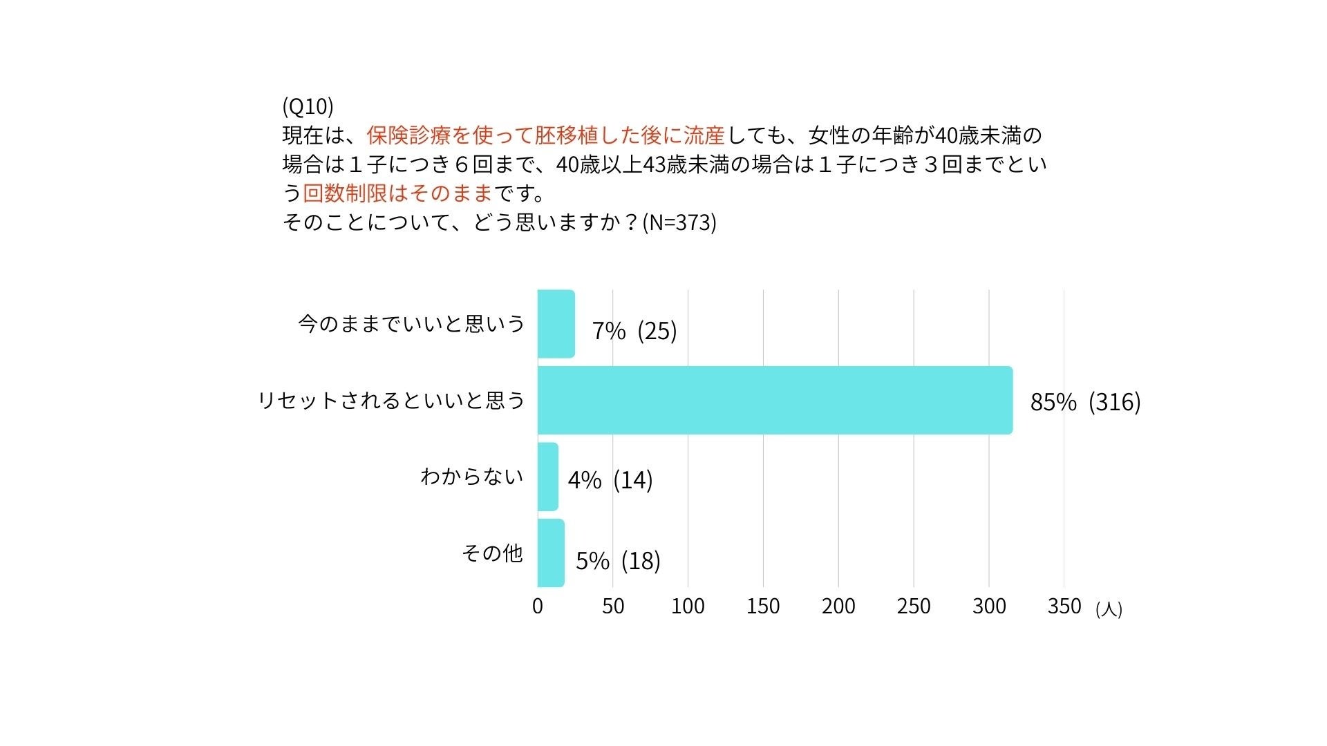 現在、保険診療を使って胚移植した後に流産しても、胚移植の回数制限はそのままです。この状況に対して当事者の85%が「リセットされるとよいと思う」と回答しました。