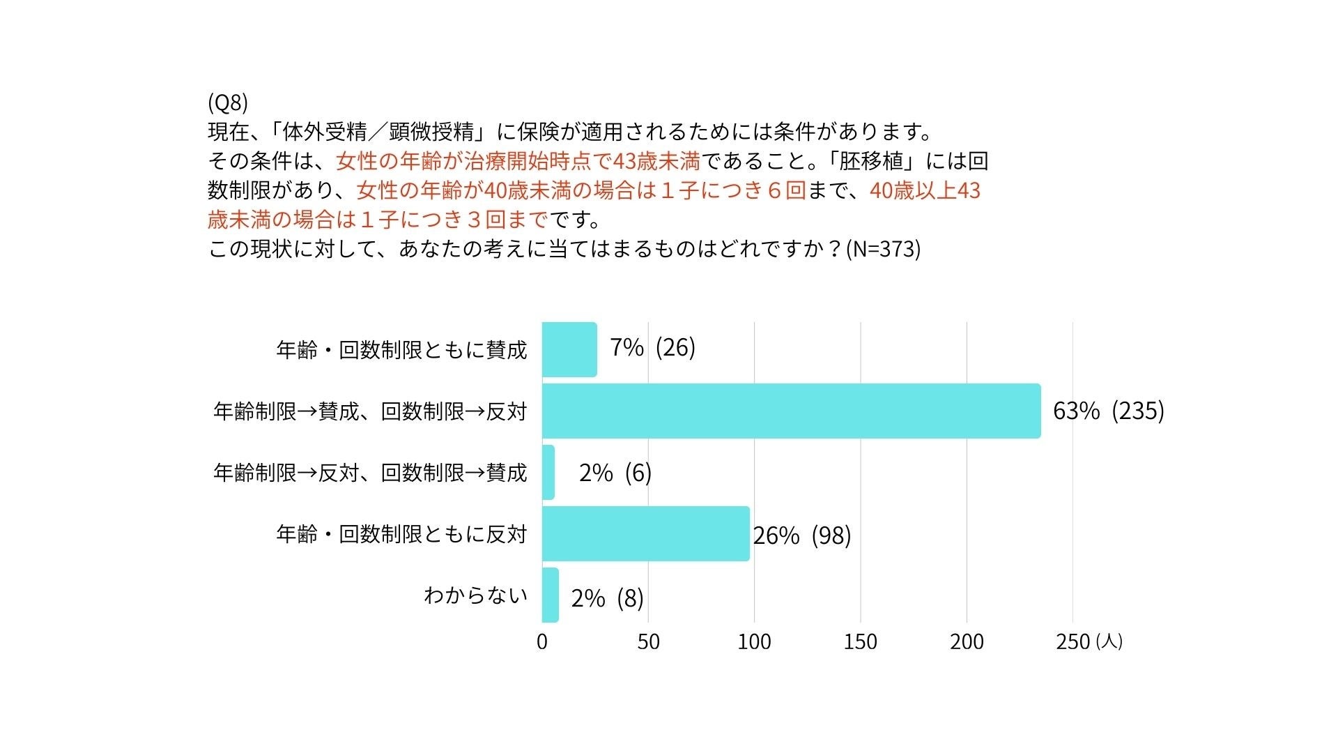 不妊・不育症当事者の63%が、保険診療による不妊治療の「年齢制限に賛成、回数制限に反対」し、流産後に回数がリセットされない現行制度に、85%が「回数リセットを望む」