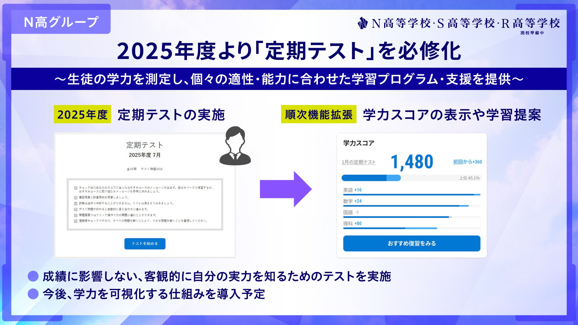 これまでは単位取得のためのテストのみを実施していましたが、2025年度より導入する「定期テスト」は、テスト結果が成績や高校卒業資格の取得に影響しない、定期的に生徒一人ひとりの学力・習熟度を測るテストとして行います。生徒個々の学力を測定し、学習データの蓄積・分析を行うことで、それぞれの適性・能力に合わせた学習プログラム・支援を提供し、生徒一人ひとりへのさらなる学習サポートに取り組んでいきます。