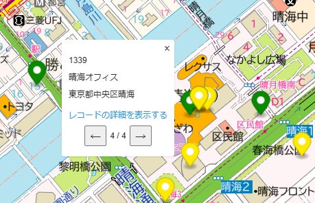 地図上に各レコードの位置情報をもとにマーカーが表示されます。各物件の位置関係や物件の密集度など全体像を把握するのに役立ちます。