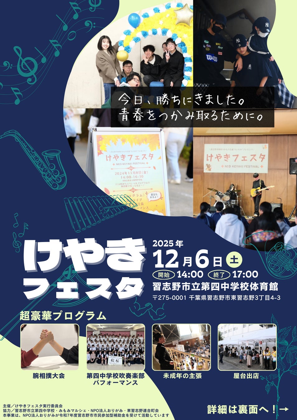 NPO法人おりがみ(代表理事:都築則彦、事務局:千葉県習志野市香澄3丁目8番8号)は、2025年12月6日に習志野市立第四中学校にて、生徒主体で企画・運営を行う地域共創イベント 「けやきフェスタ」 を開催します。今年のテーマは 「今日、勝ちにきました。~青春を掴み取るために~」。中学生の自主性と地域の力を掛け合わせ、学校の枠を超えた新しい地域行事・文化祭の形を創出します。
