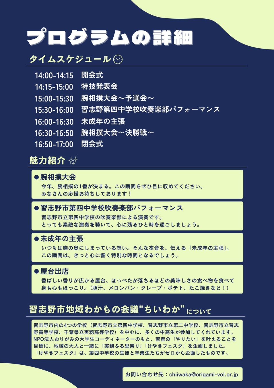 協力:習志野市立第四中学校、みもみマルシェ、NPO法人おりがみ、東習志野連合町会
